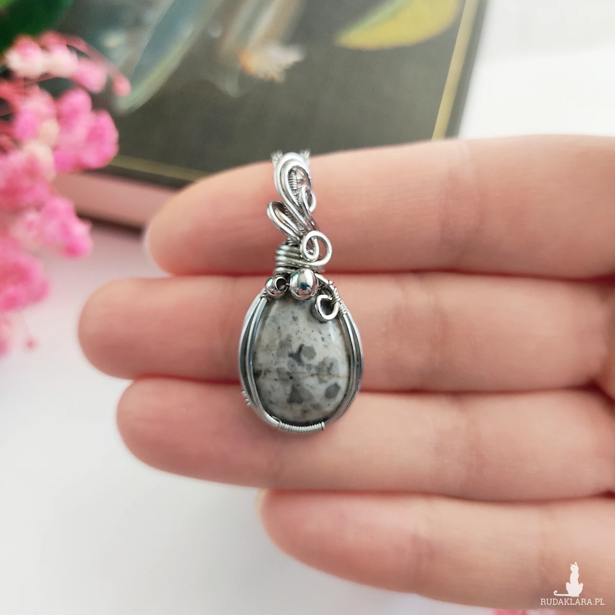 Naszyjnik Jaspis Szary ręcznie wykonany z drutów ze stali chirurgicznej metodą wire wrapping.