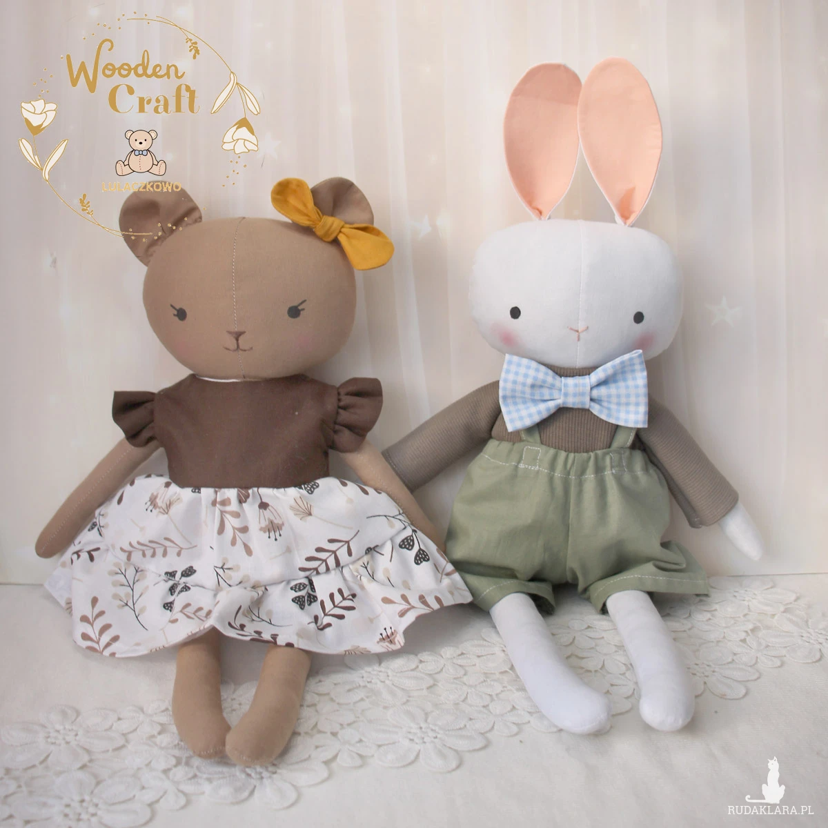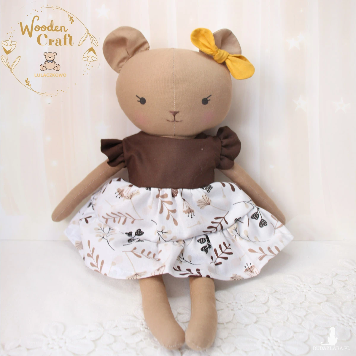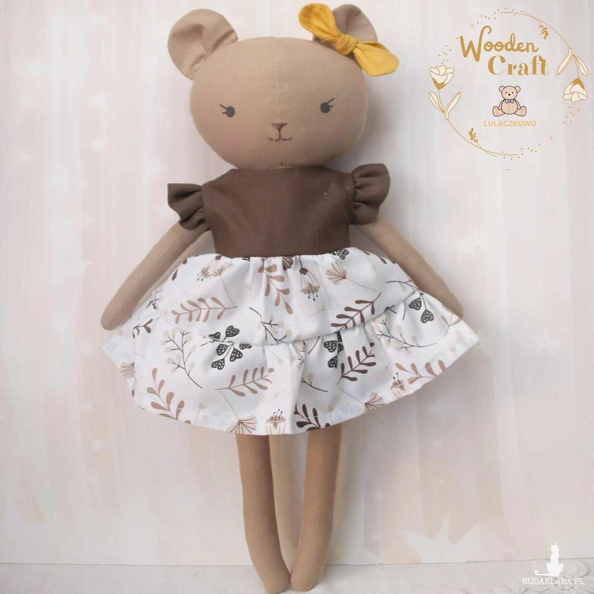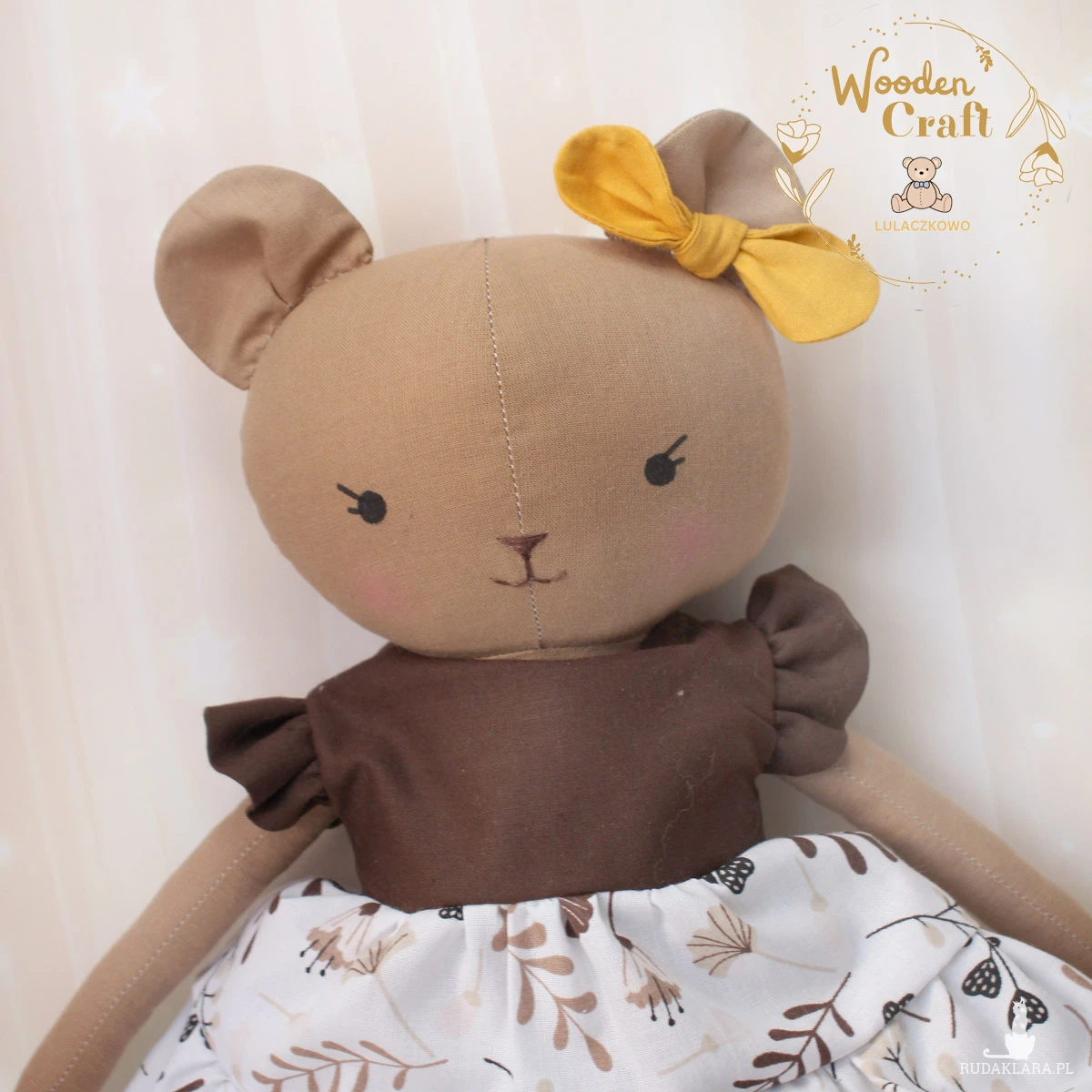 Przeurocza przytulanka, miś, a właściwie misia w kolorze ciemnego beżu, uszyta ręcznie z najwyższą starannością, ubrana w uroczą sukieneczkę z falbankami w kolorze brązu z motywem kwiatowym, z musztardową kokardką na uszku. Wykonana ze 100% bawełny, wypełniona antyalergiczną kulką silikonową. Oczka malowane wodoodpornym markerem, nosek i buźka wyszyte muliną. Górne i dolne łapki układają się luźno, misiunia siedzi z podparciem. Sukieneczkę można swobodnie zdejmować, jest zapinana na rzep.