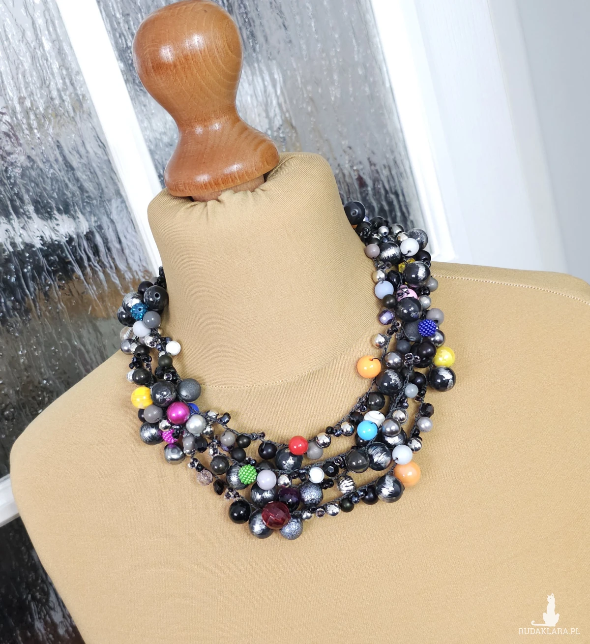 Ten ręcznie robiony naszyjnik to dynamiczna, wielowarstwowa kompozycja, która z pewnością nie pozwoli przejść obok Ciebie obojętnie.