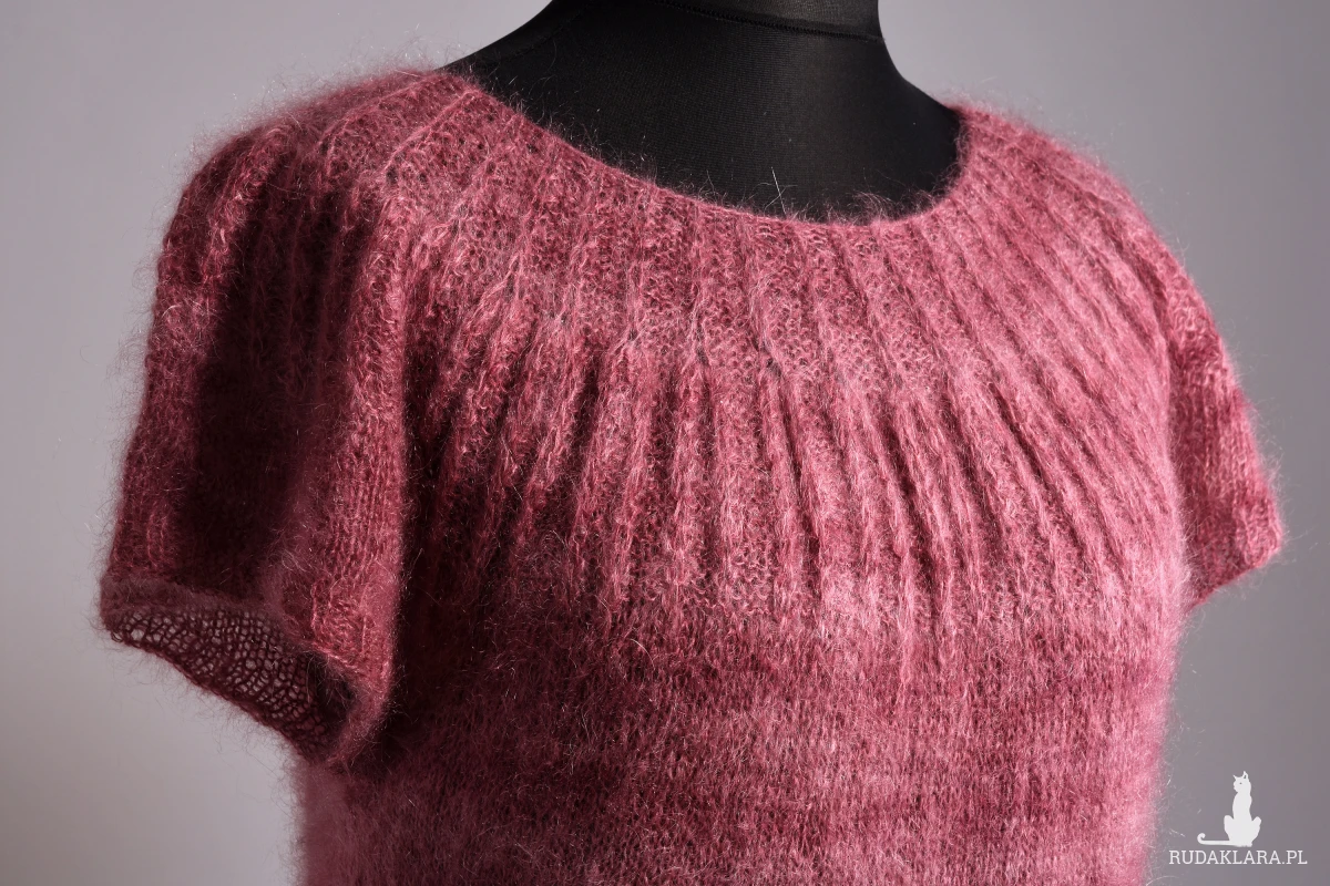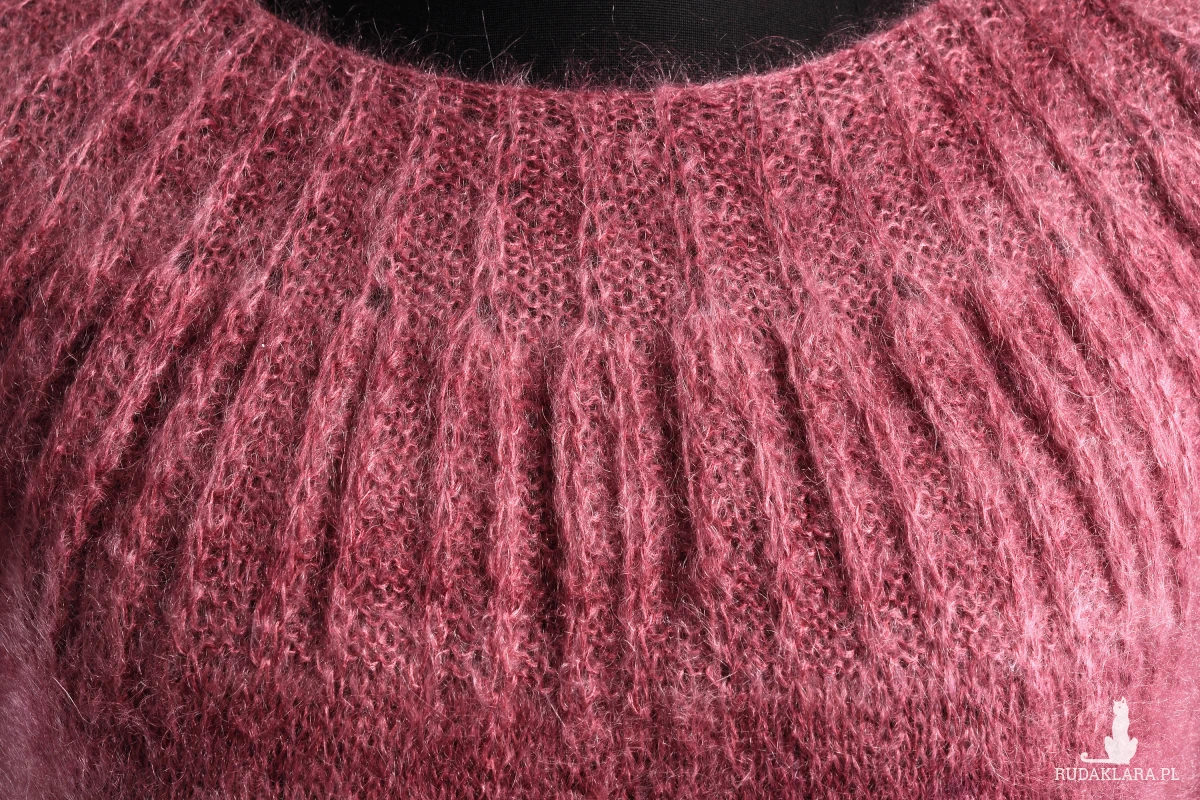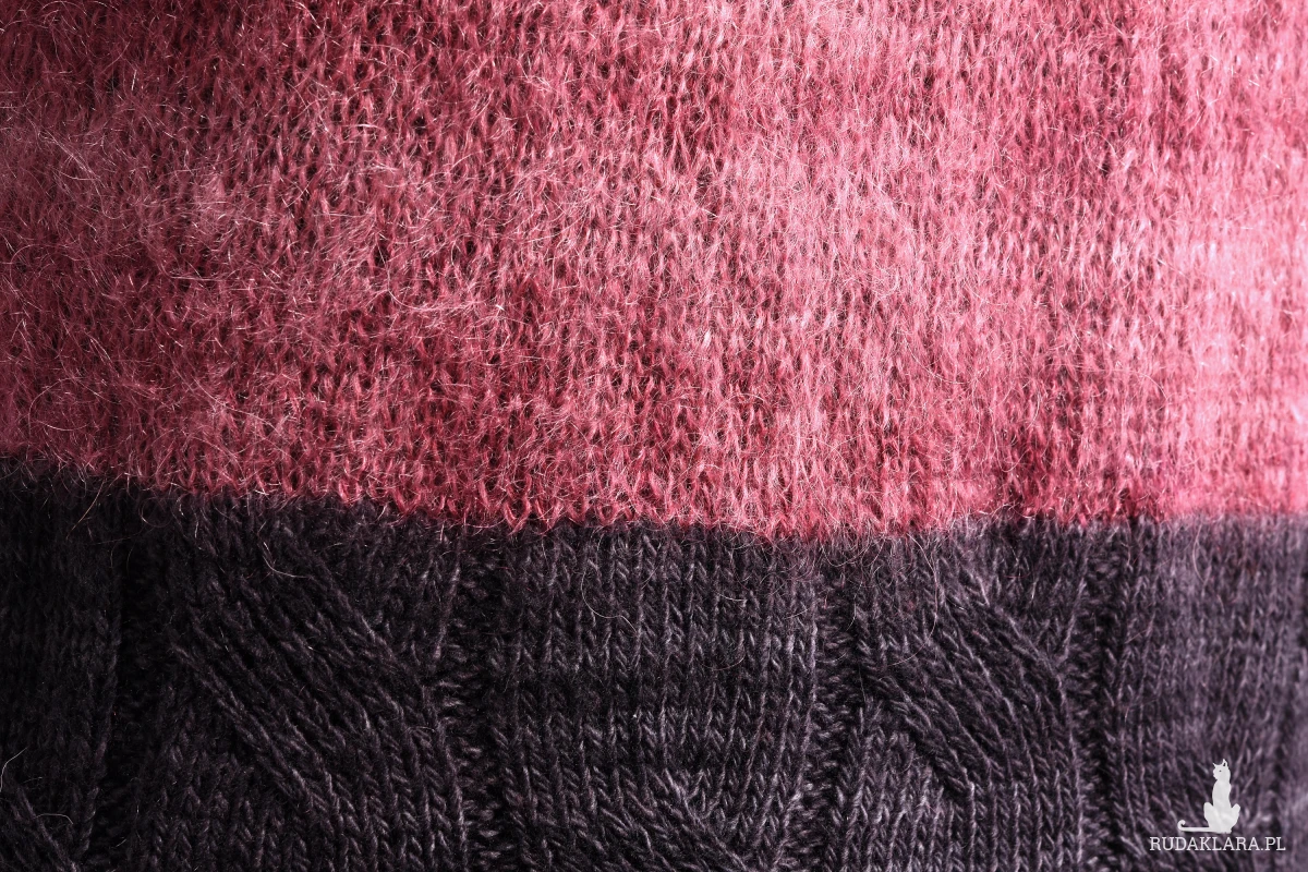 Damska tunika, podkreślająca walory kobiecej figury. Zrobiona ręcznie. Zrobiona na drutach. Tunika powstała ze śmiałego połączenia dwóch rodzajów włóczki: moheru w odcieniach różu i wełny z merynosów w odcieniach szarości. Okrągły dekolt podkreślony wzorem strukturalnym optycznie poszerza ramiona i powiększa biust. Szara część wykonana wzorem warkoczy, zaczynająca się tuż nad talią spływa wzdłuż sylwetki, optycznie ją wyszczuplając. Dzianina miękka i lekka, przyjemna w dotyku.