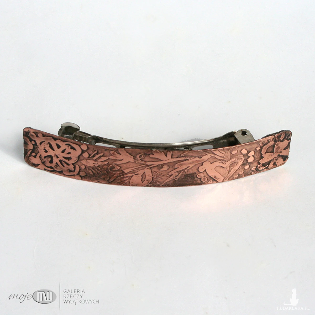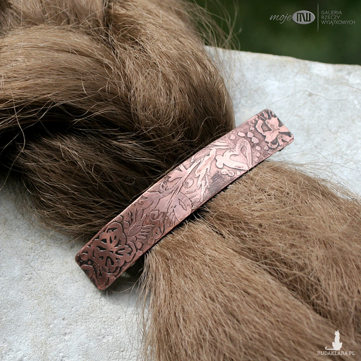 W miedzianej blasze wytrawiłam florystyczne wzory, potem patynowałam i przetarłam dla wydobycia rysunku. Klamra to standardowy metalowy mechanizm.