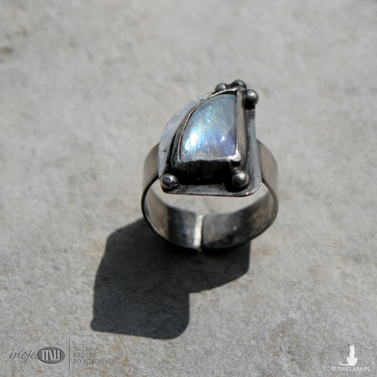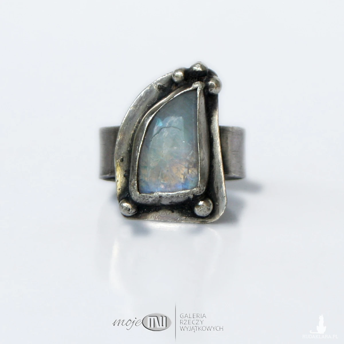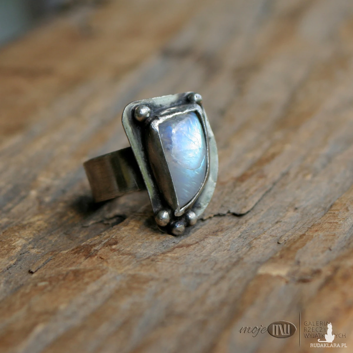Pierścionek z kamieniem księżycowym ze srebra próby min. 925 - oksydowany i miejscowo polerowany. Kamień oprawiony jest dość prosto, dodatkową ozdobą są tylko kuleczki srebra i nieco szersza obrączka.