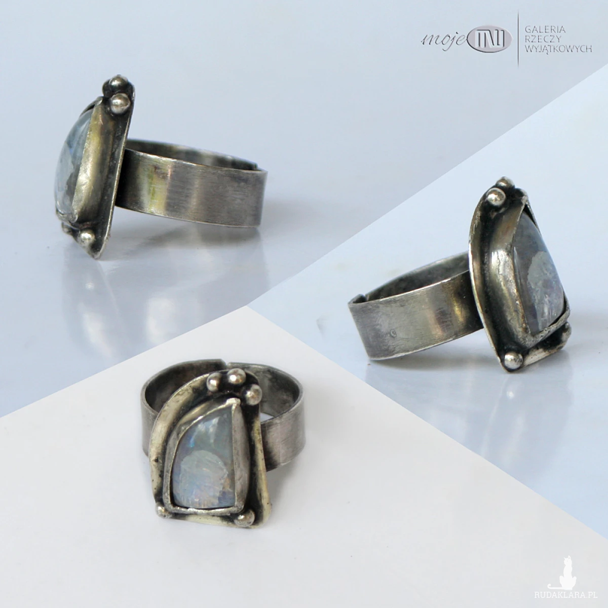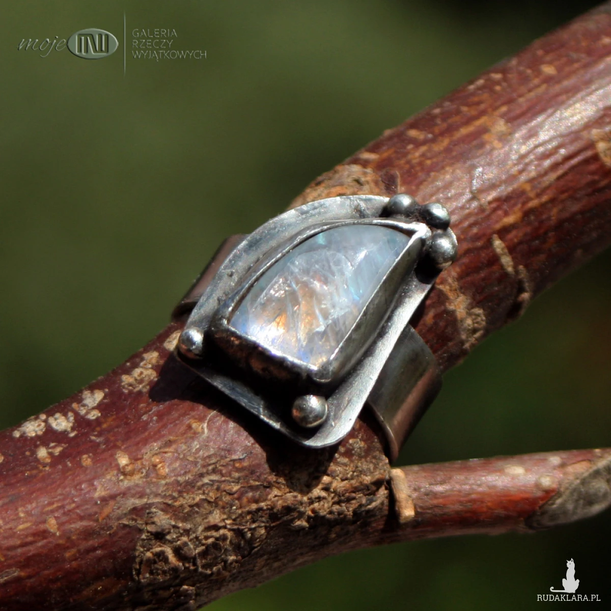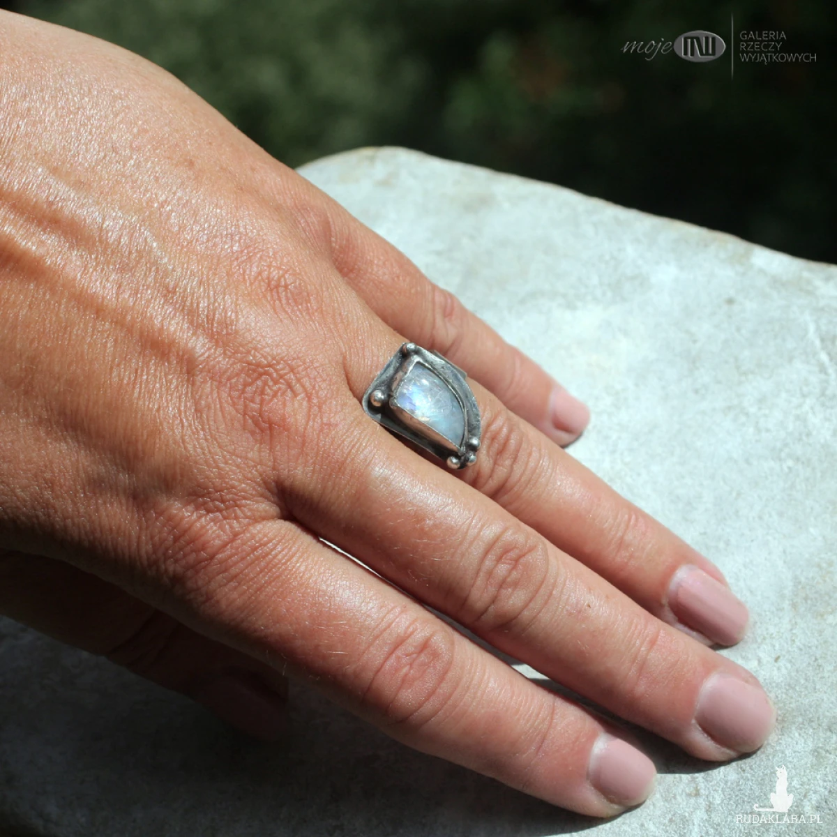 Pierścionek z kamieniem księżycowym ze srebra próby min. 925 - oksydowany i miejscowo polerowany. Kamień oprawiony jest dość prosto, dodatkową ozdobą są tylko kuleczki srebra i nieco szersza obrączka.