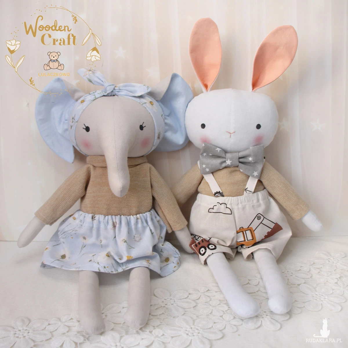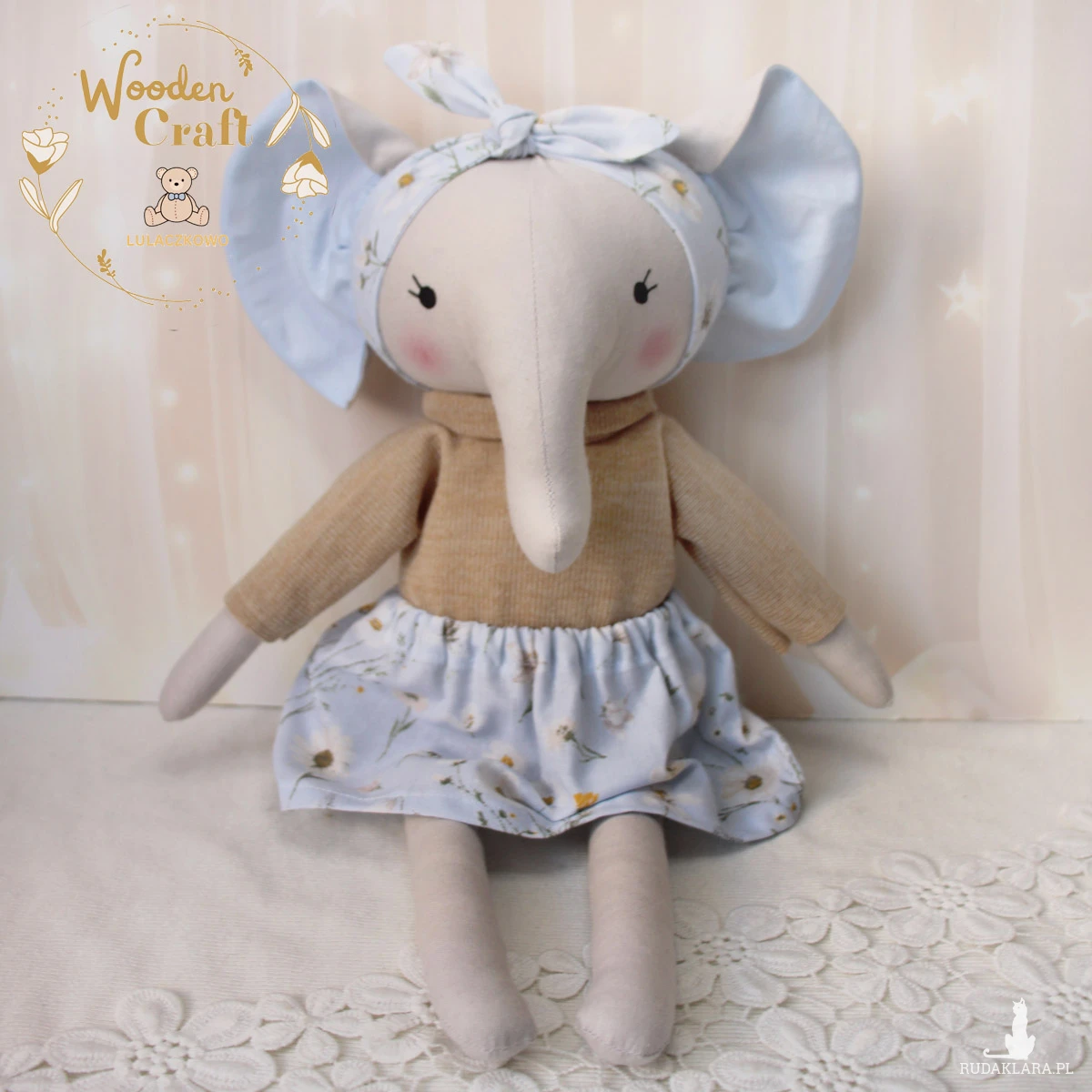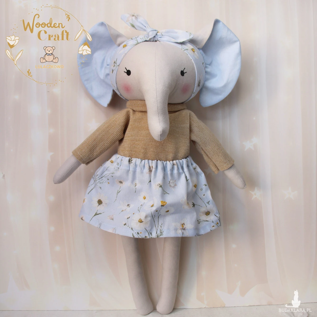 Przeurocza przytulanka słonik, a właściwie słoniczka w kolorze szarym, uszyta ręcznie z najwyższą starannością, ubrana w uroczy beżowy sweterek oraz błękitną spódniczkę z motywem stokrotek, z błękitną opaską na głowie. Wykonana ze 100% bawełny, wypełniona antyalergiczną kulką silikonową. Oczka malowane wodoodpornym markerem. Górne i dolne łapki układają się luźno, słoniczka siedzi z podparciem. Zarówno sweterek jak i spódniczkę można swobodnie zdejmować, w pasie jest wciągnięta gumeczka.