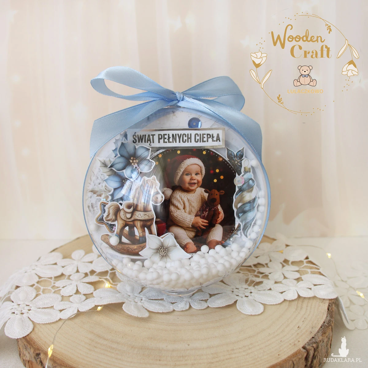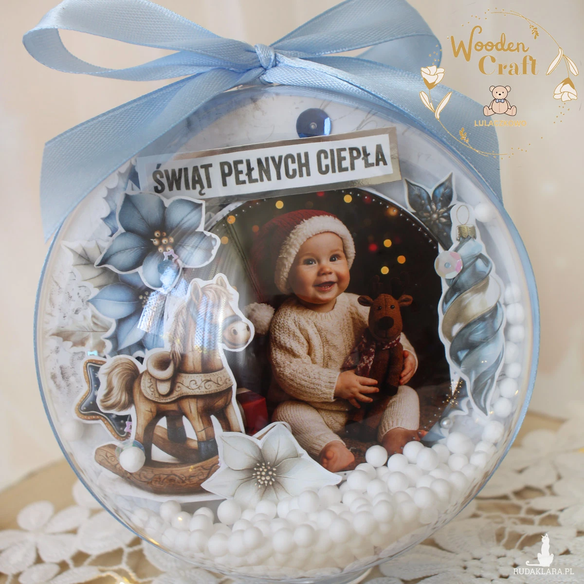 Przepiękna, bogato zdobiona bombka na choinkę ze zdjęciem dziecka i napisem "Świąt Pełnych Ciepła" - idealna jako pamiątka z pierwszych świąt maluszka lub np. prezent dla dziadków.