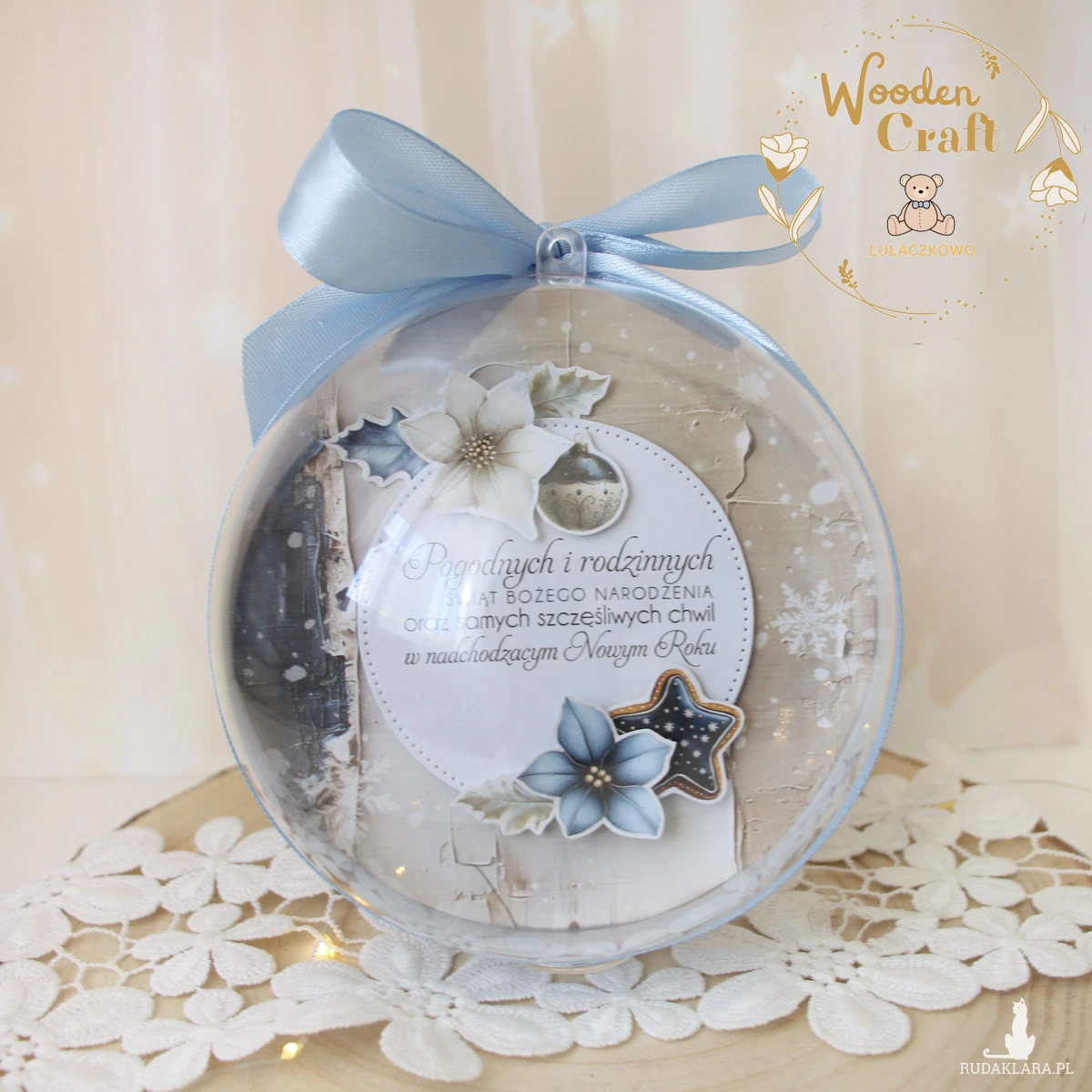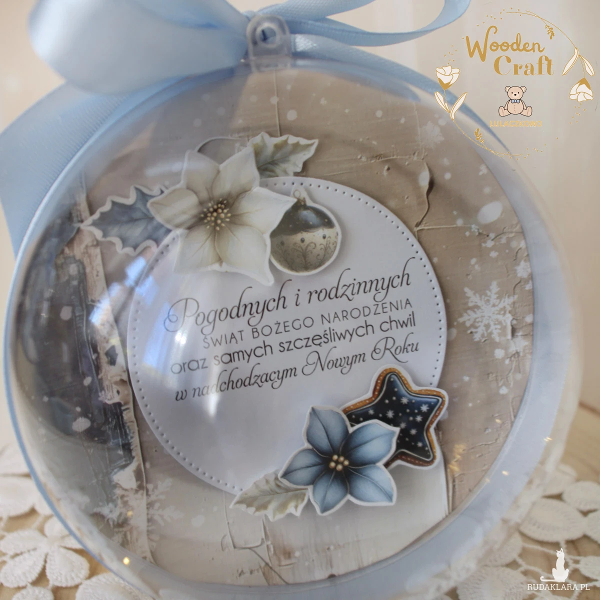 Bombka wykonana ręcznie z dbałością o każdy szczegół. We wnętrzu umieszczona została kompozycja z grafikami poinsecji oraz świątecznymi, a także przesłane przez Państwa zdjęcie maluszka. Na spodzie bombki znalazły się błyszczące cekiny gwiazdki oraz kuleczki imitujące śnieg. Na odwrocie bombki wklejone zostały życzenia świąteczne. Całość przewiązana błękitną kokardą.