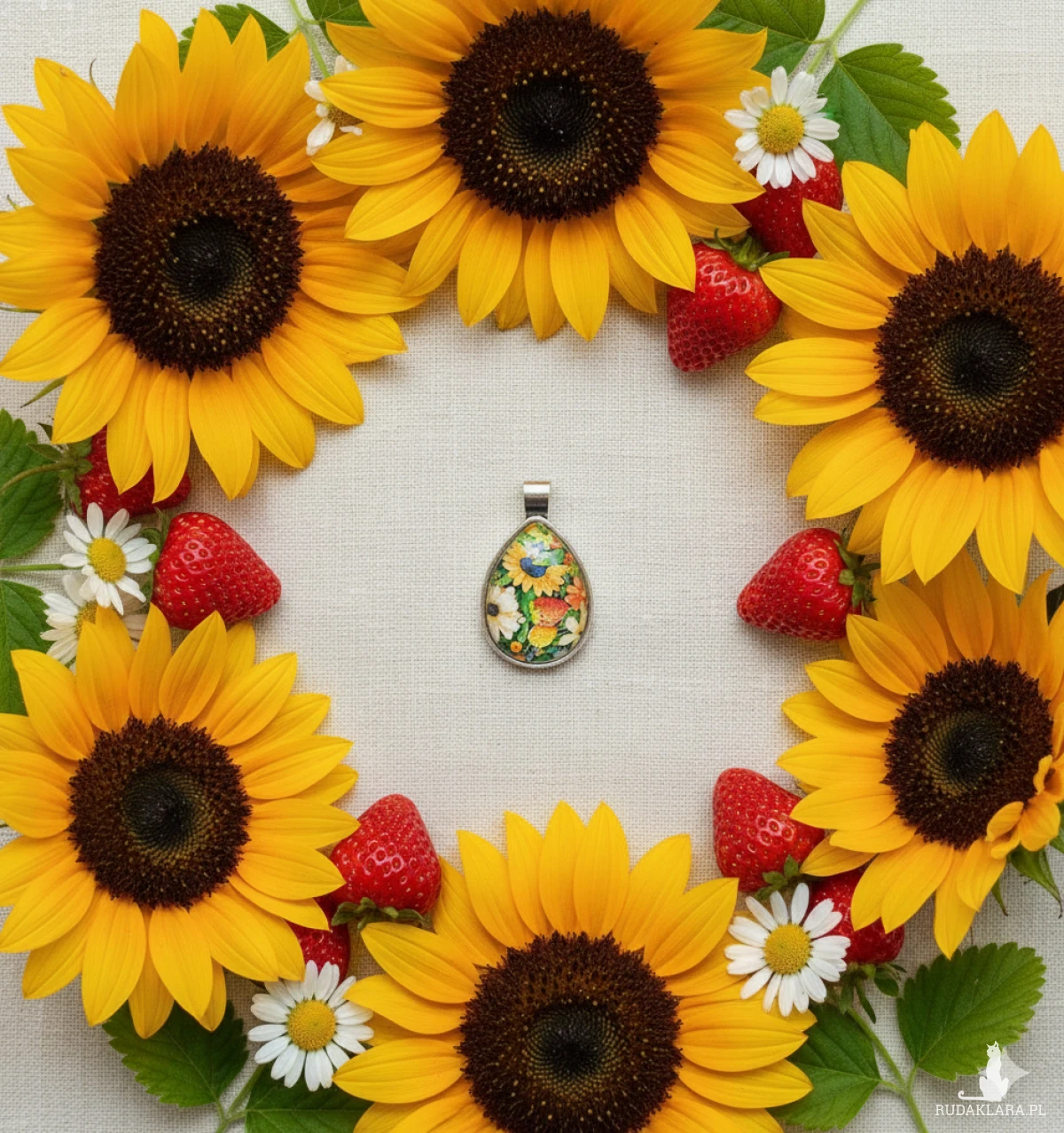 Przedstawiamy nasz wisiorek, który jest kwintesencją lata - 'Letni Ogród'! 🌻🍓 Ten ręcznie wykonany wisiorek w kształcie kropli to miniaturowa kompozycja pełna słońca: intensywne słoneczniki, barwne kwiaty i urocze truskawki. Srebrna oprawa, wysokiej jakości grafika i szklana kopułka tworzą spójną i elegancką całość.