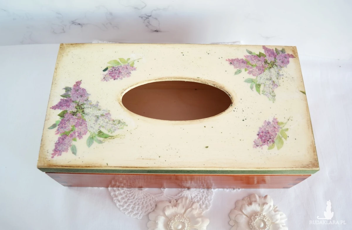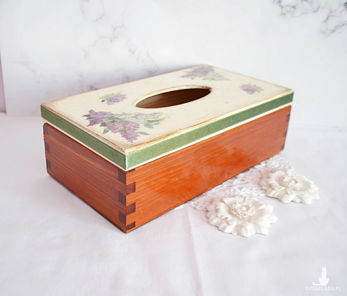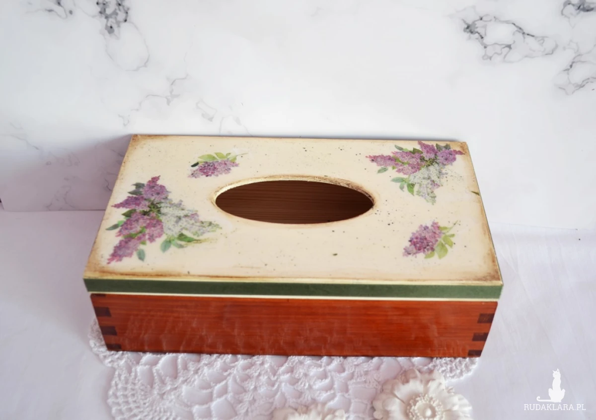 Oryginalny drewniany chustecznik w kolorach brązu i zieleni zdobiony metodą decoupage. Chustecznik jest zabezpieczony lakierem bezbarwnym