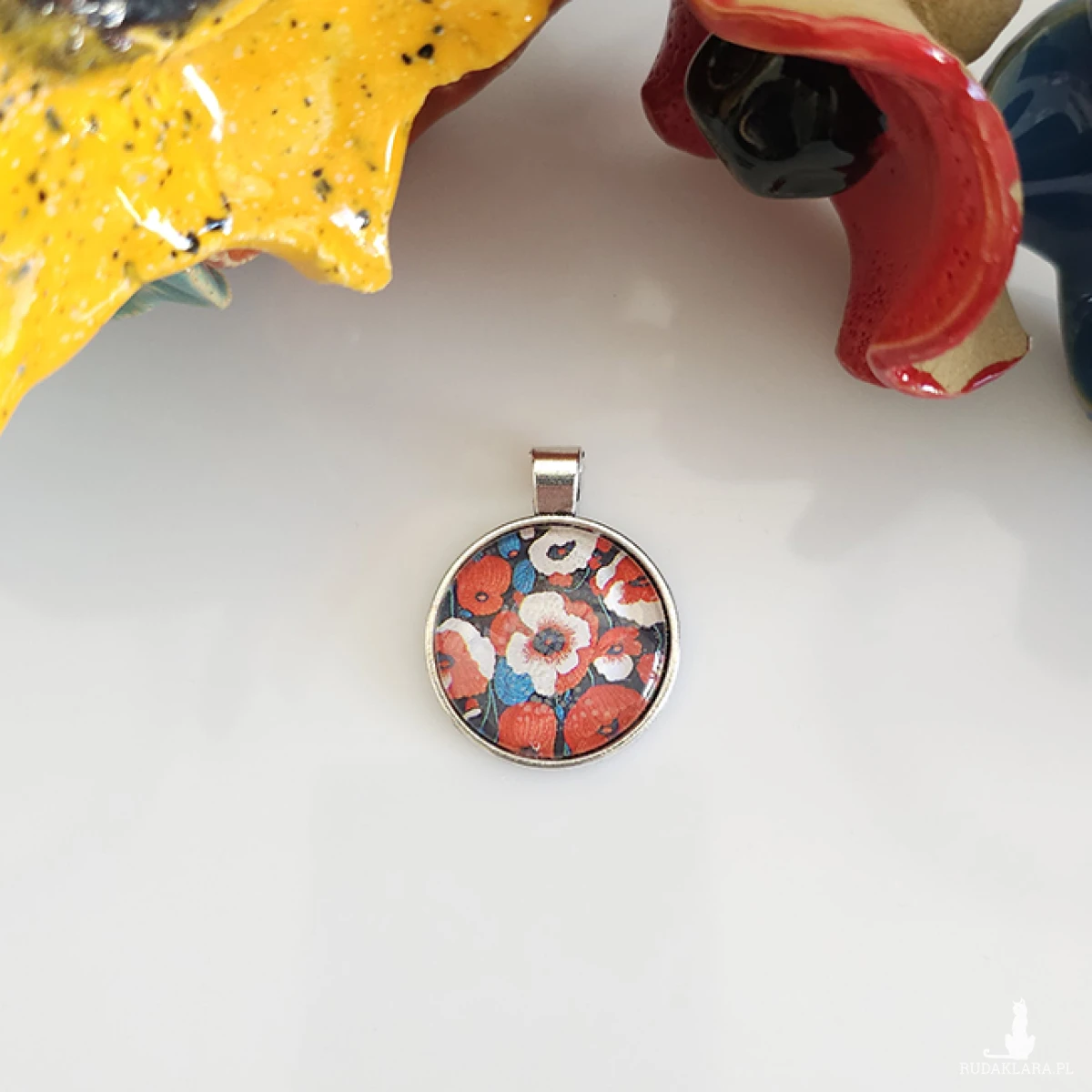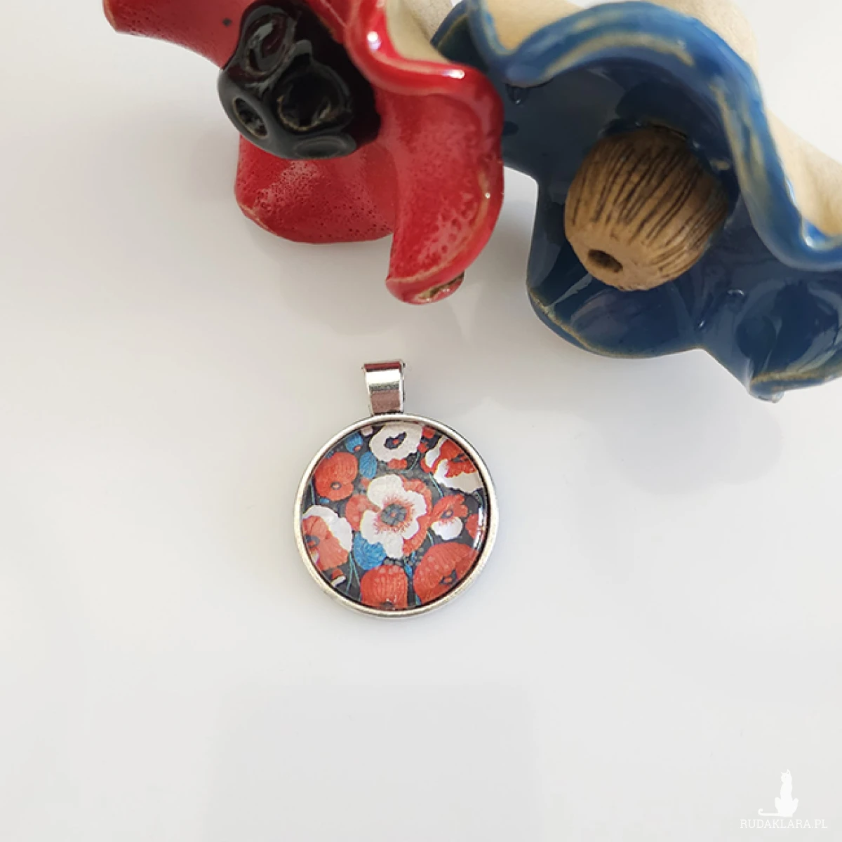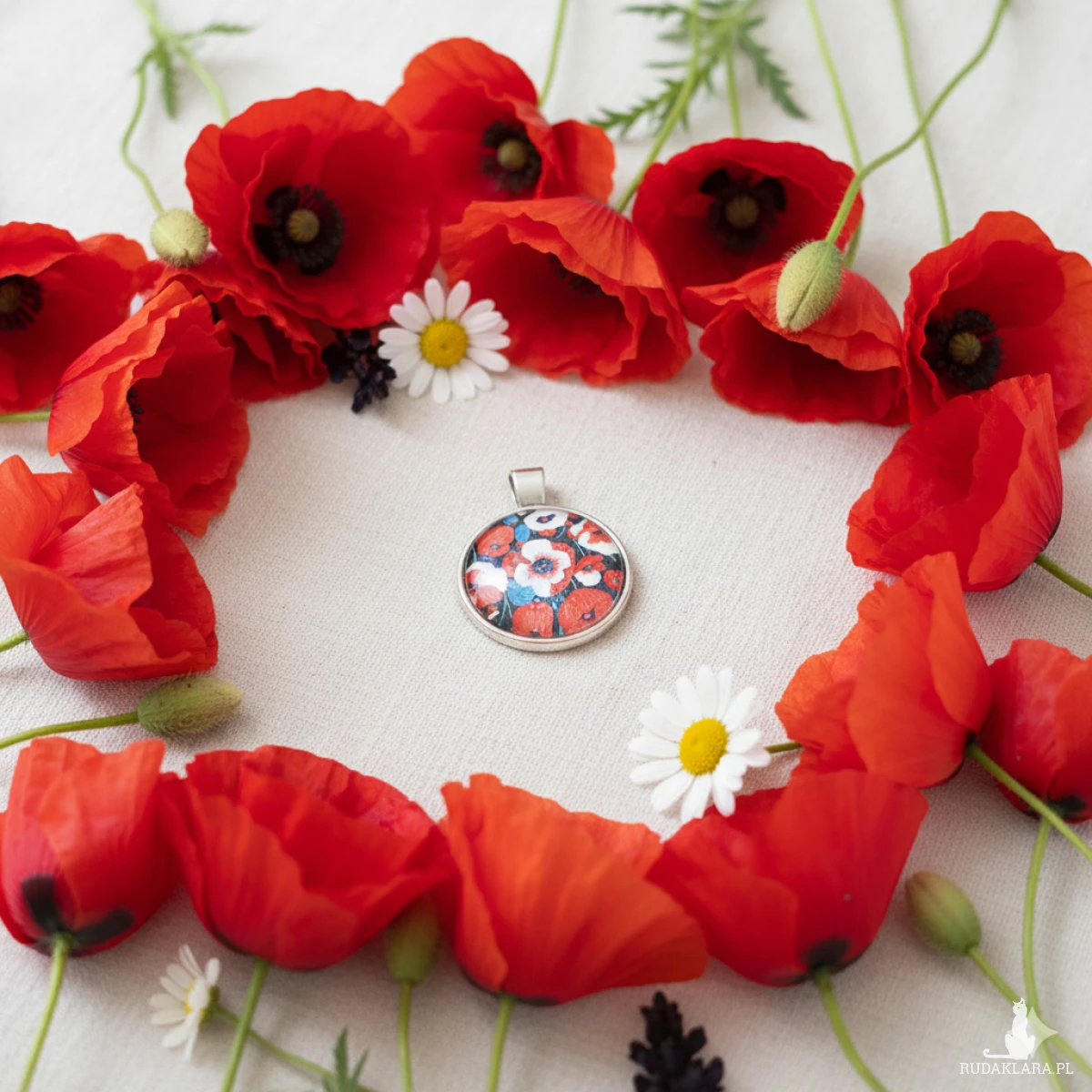 Klasyczny, a jednocześnie nowoczesny wisiorek - 'Makowe Pole'! ❤️ Ten ręcznie wykonany wisiorek to miniaturowa łąka, pełna intensywnie czerwonych maków, bieli i odrobiny błękitu. Okrągła oprawa w srebrnym kolorze, wysokiej jakości grafika i szklana kopułka tworzą spójną i elegancką kompozycję.