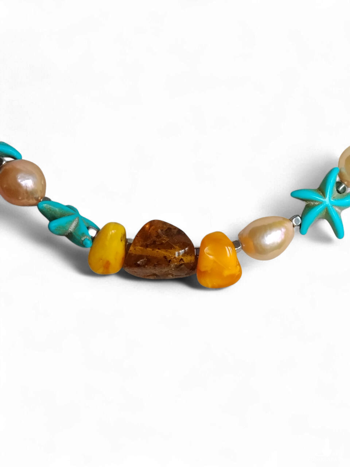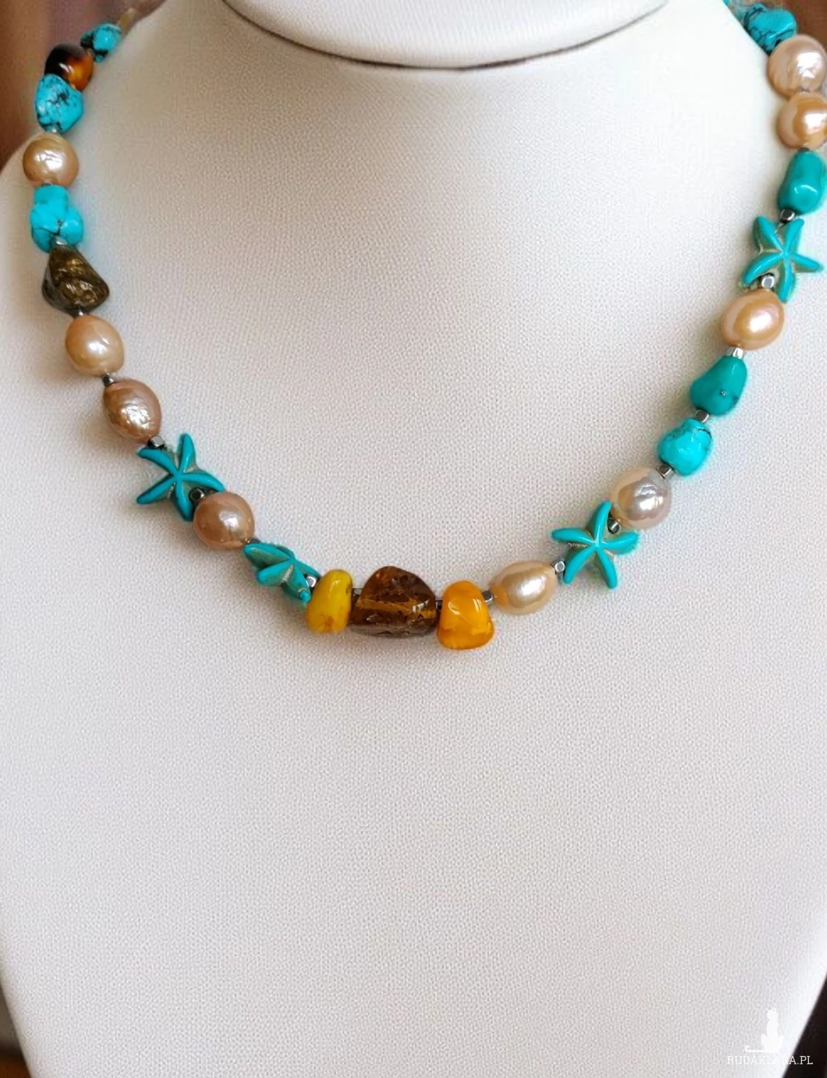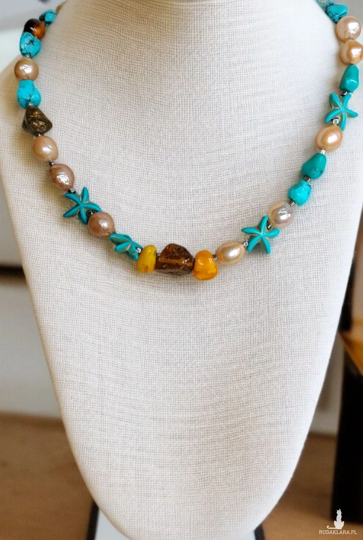 Ten naszyjnik będzie w krótkie zimowe dni przypominać o lecie i morzu, zrobiony bowiem został z darów morza - pereł barokowych, bursztynów i turkusowych howlitów, które co prawda nie należą do owoców morza, ale przypominają je kolorem. Wielkość elementów naszyjnika wynosi ok.10 mm, wykończenie to stal szlachetna, długość naszyjnika 45 cm.