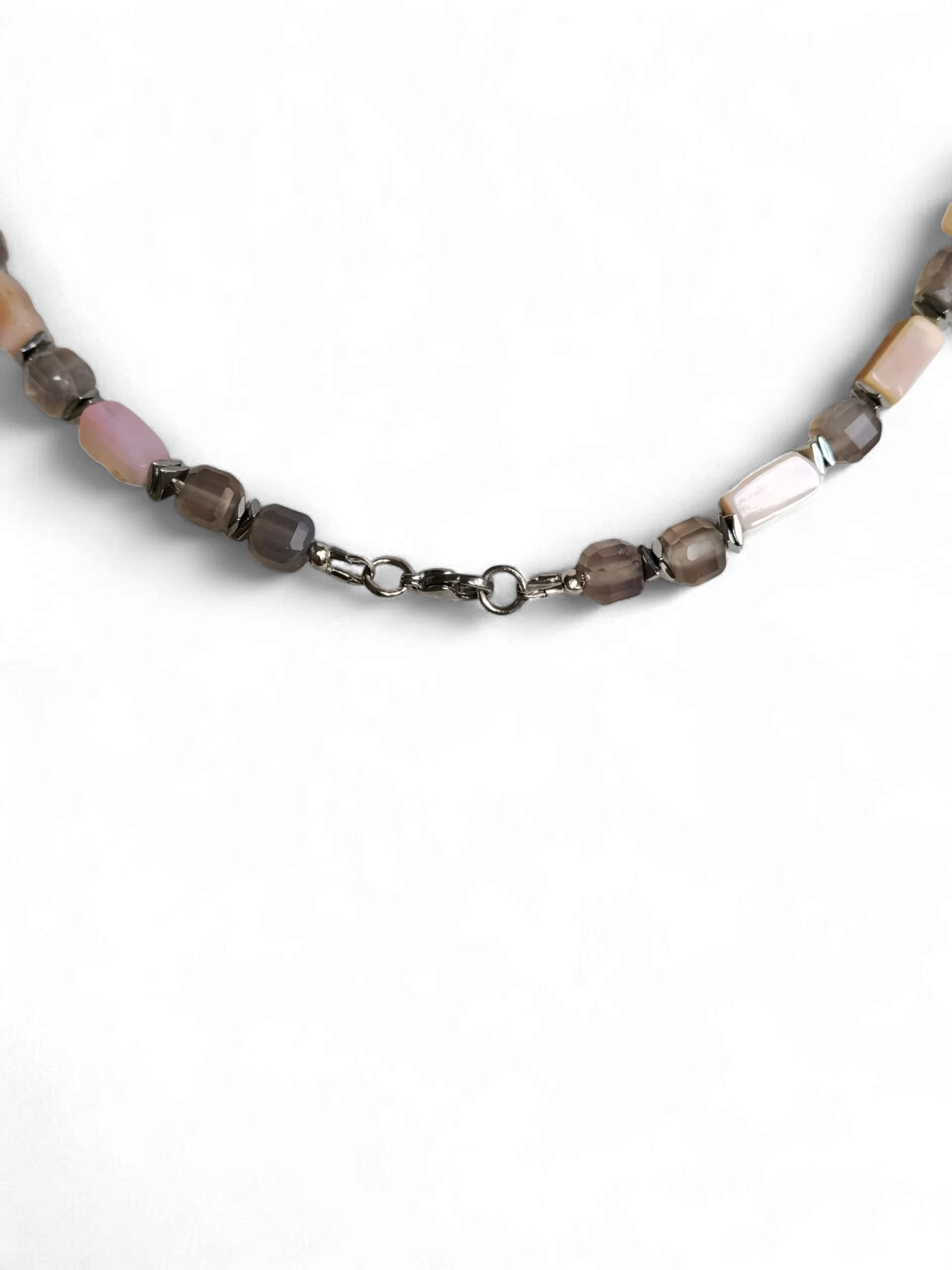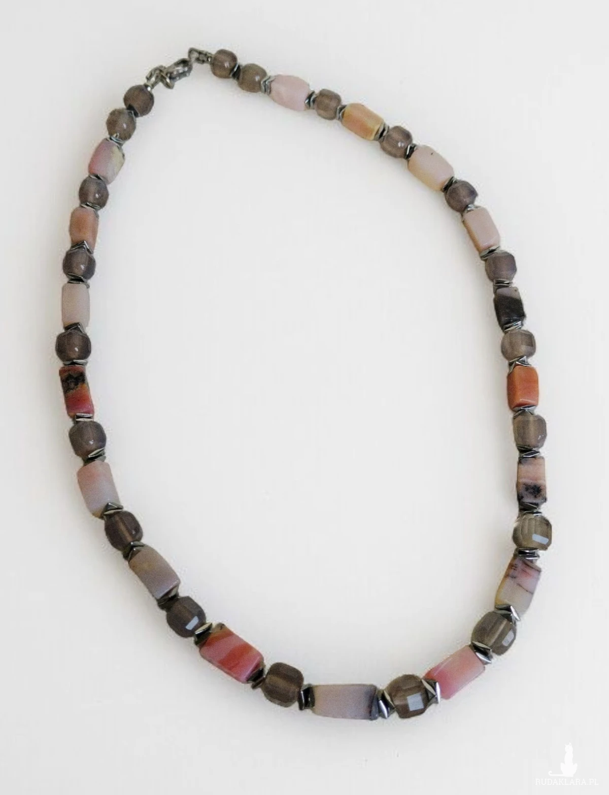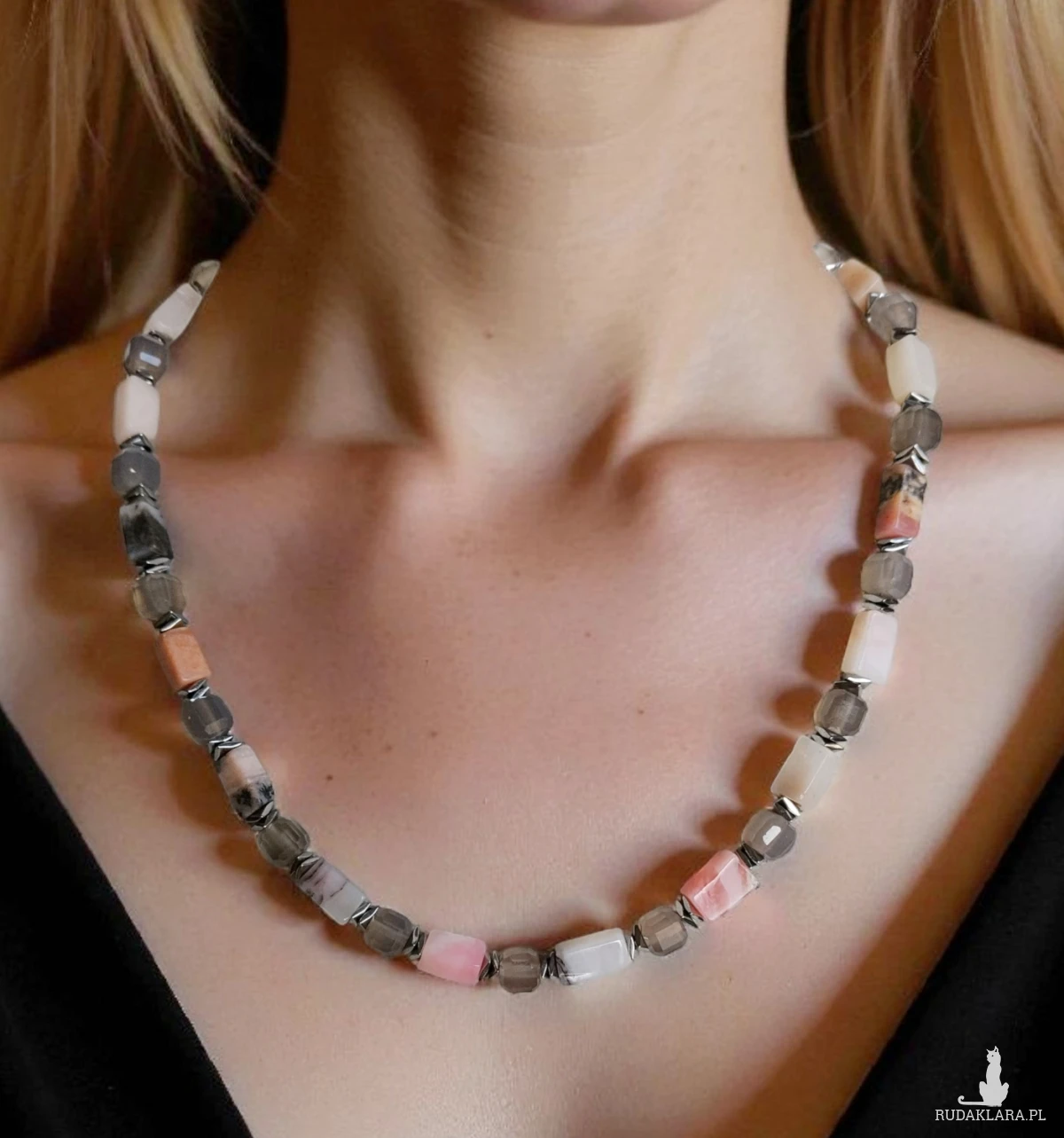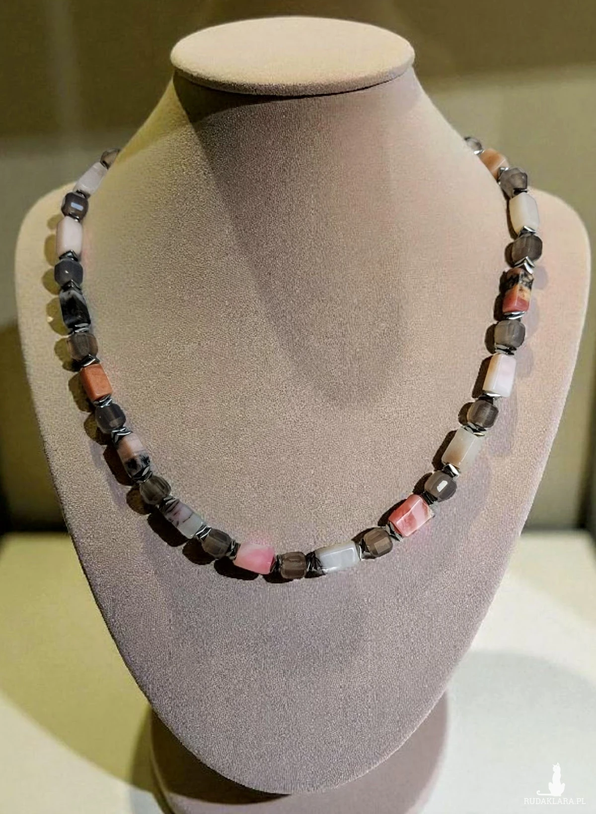 Naszyjnik wykonany został z opali australijskich w formie prostopadłościanów , surowych, dość nieregularnych, a tę ich surowość łagodzą fasetowane kostki morganitów o wielkości 6 x 6 mm i srebrnych hematytów. Z kolei dla zachowania harmonii różowe odcienie opali łagodzą szarość morganitowych kostek. Elementy wykończeniowe i zapięcie ze stali szlachetnej. Długość naszyjnika wynosi 44 cm.