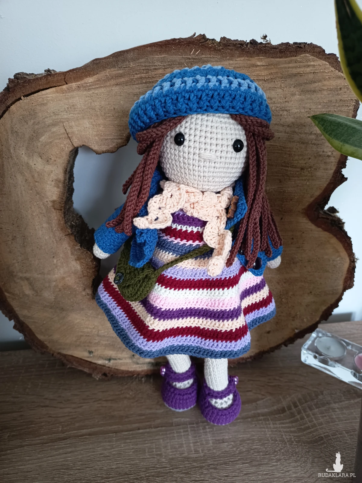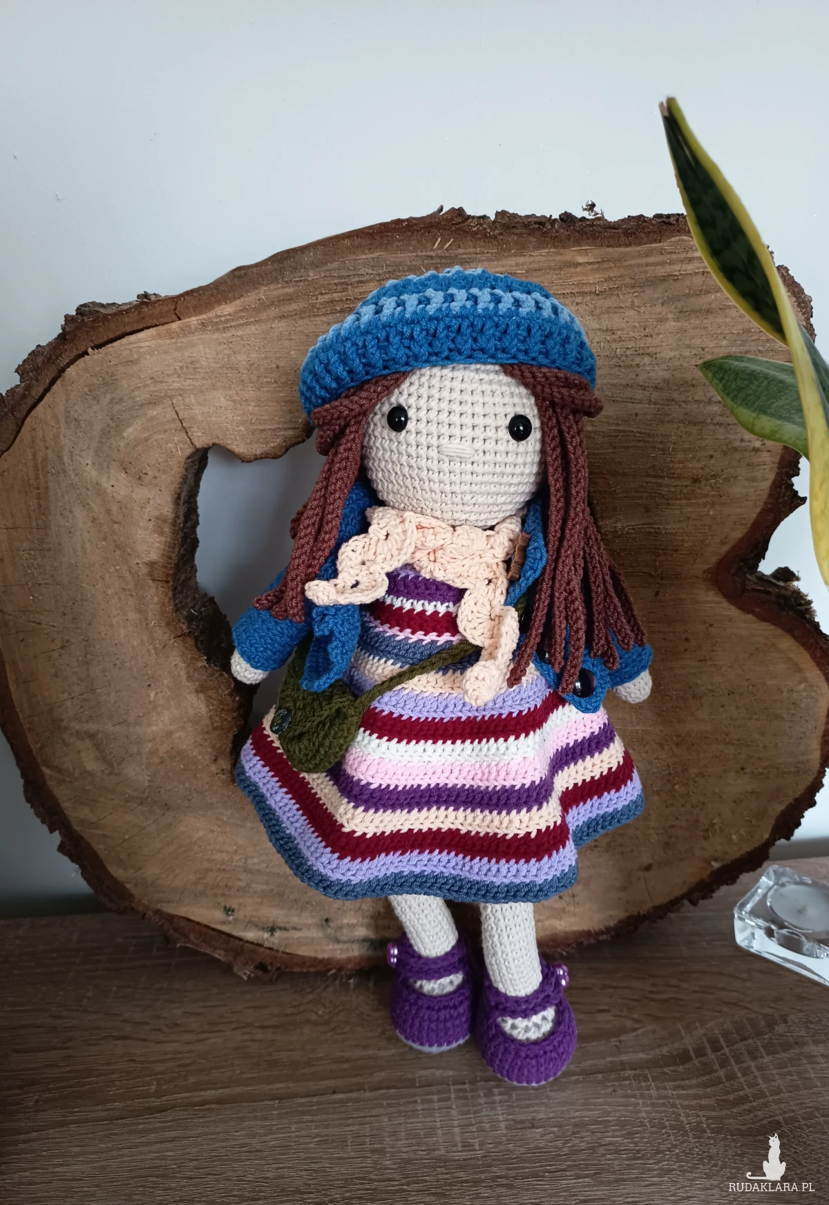 Unikatowa, ręcznie robiona szydełkowa lalka o wysokości ok. 37 cm. Wykonana z dużą starannością z wysokiej jakości włóczki YarnArt Jeans – miękkiej, trwałej i przyjemnej w dotyku, z przewagą bawełny.