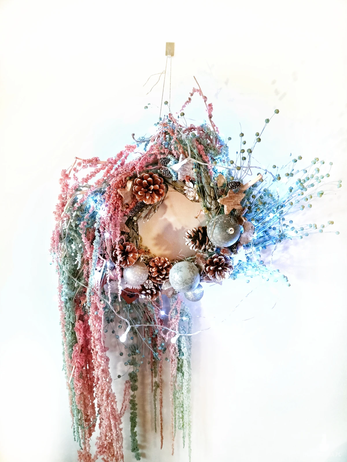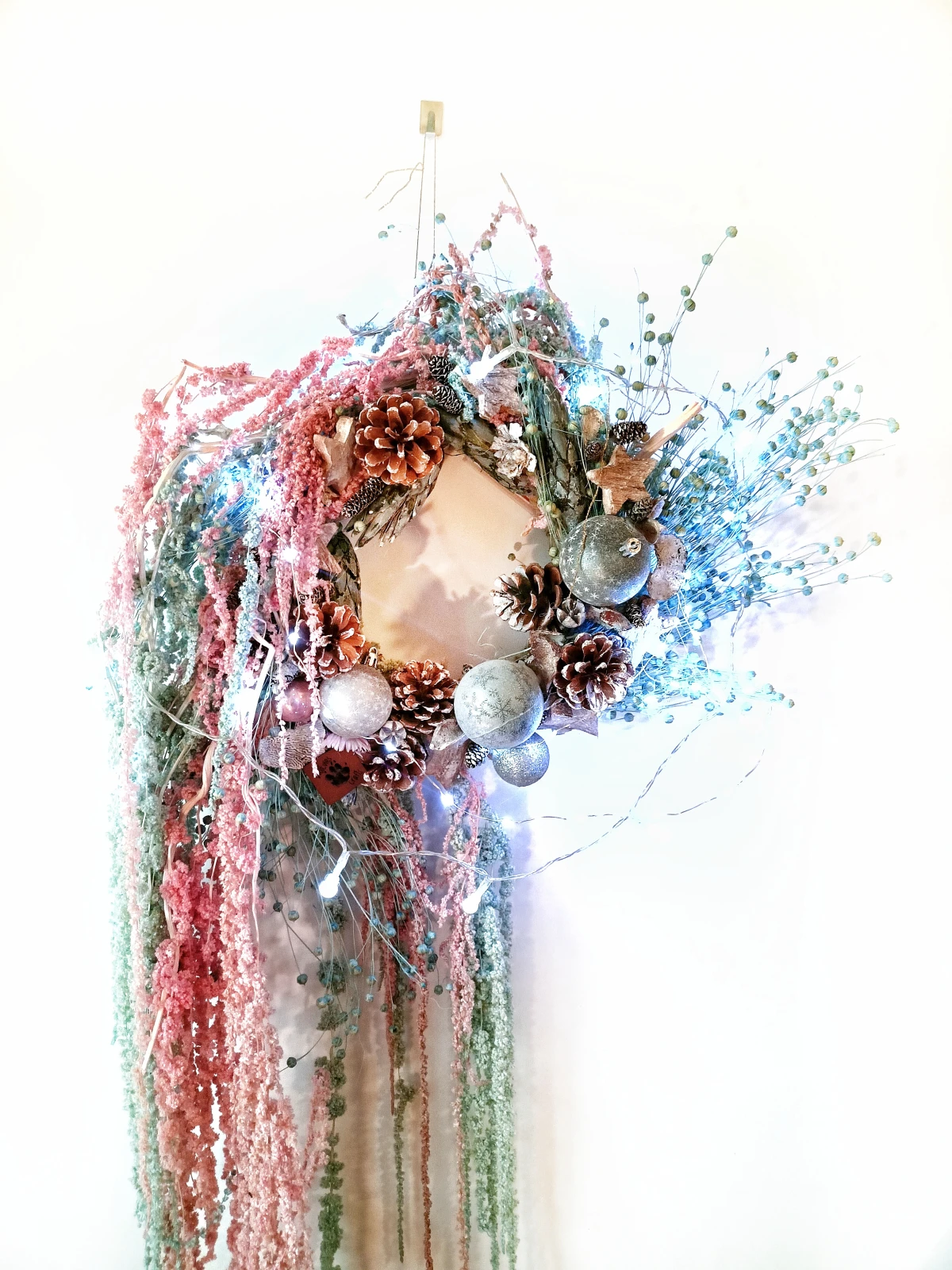wianek zimowy handmade • wianek bożonarodzeniowy • dekoracja świąteczna LED • wianek pastelowy błękitny różowy • wianek dla lodowej księżniczki • wianek z suszonych kwiatów • stroik zimowy z lampkami • dekoracja glamour • wianek na drzwi zimowy • zimowa ozdoba handmade