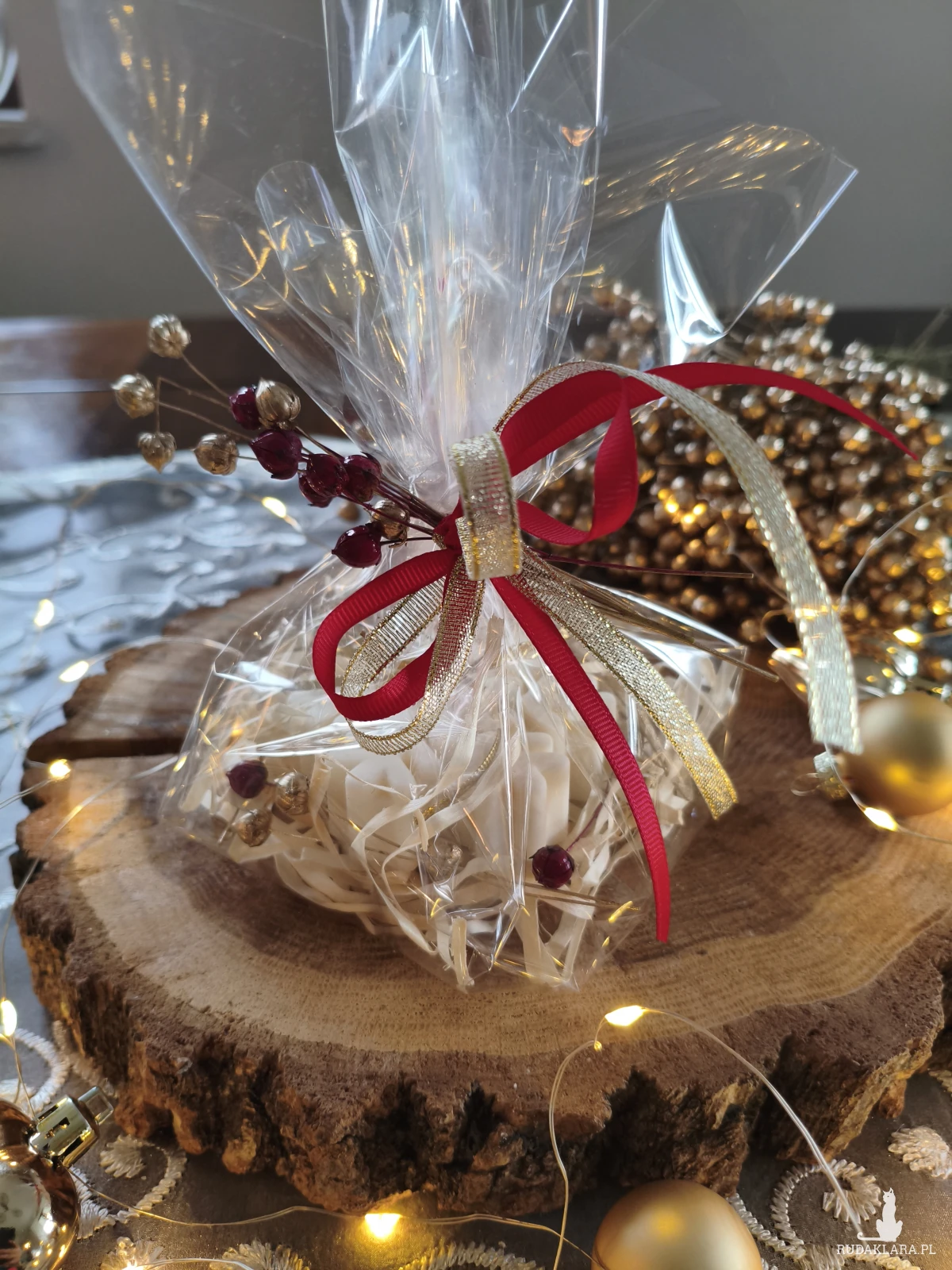 Opakowanie: dekoracyjny celofan, ozdobny bukiecik i wstążki – świeca gotowa do wręczenia jako prezent bez dodatkowego pakowania.