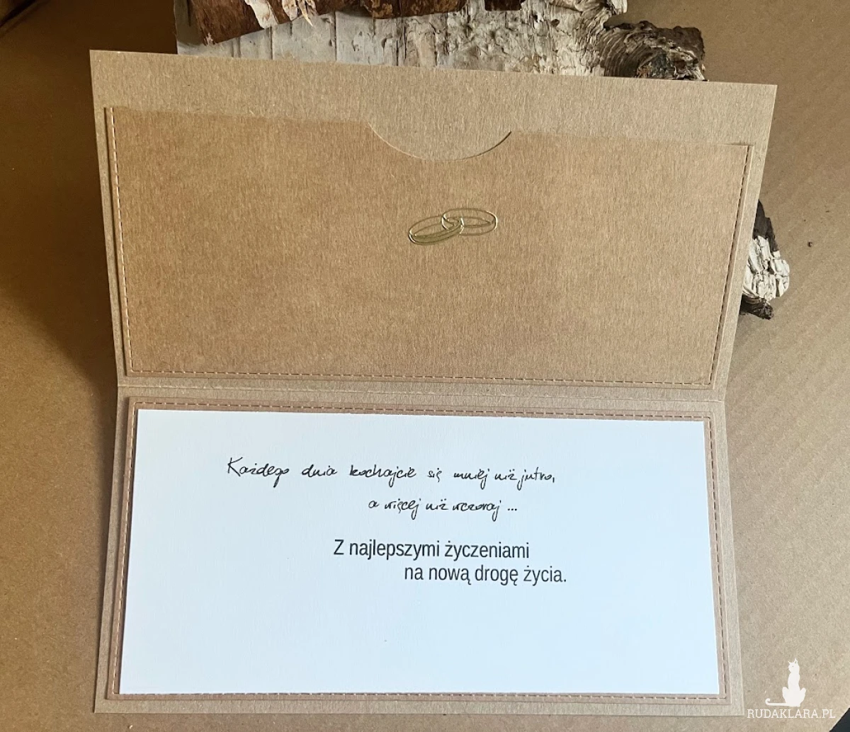 Wyjątkowa i elegancka kartka okolicznościowa , wykonana z najwyższej jakości materiałów do scrapbookingu w stylu eco. Zdobiona elementami 3D. Wykonana z dbałością o każdy detal. Kartka przestrzenna z kopertą. Wewnątrz kartki znajduje się kieszonka na małe co nieco lub kupon lotto oraz gotowe życzenia do własnoręcznego podpisu. Wielkość kartki 11x21 a koperty 12x22.