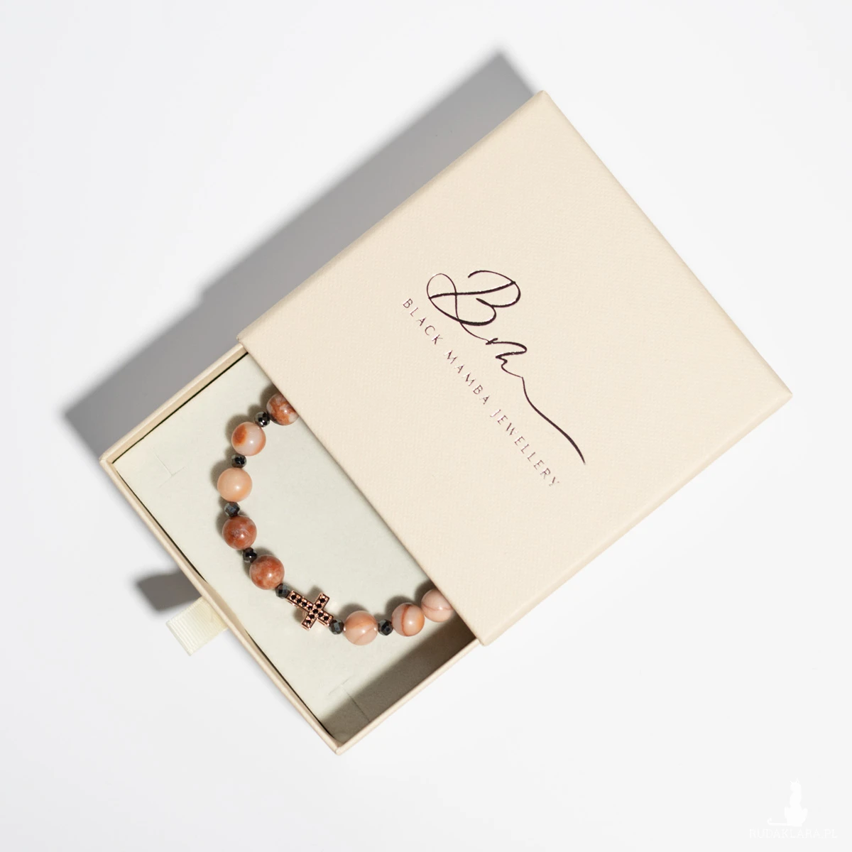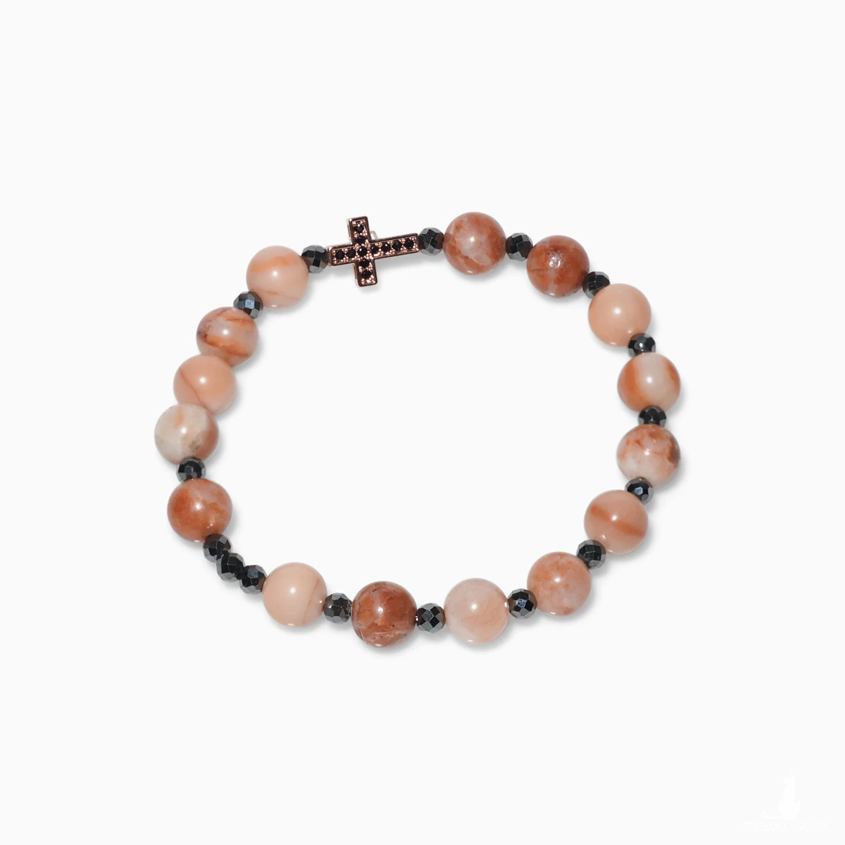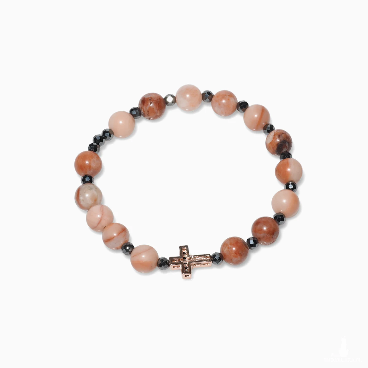 Unikatowa damska bransoletka różaniec z jadeitem brzoskwiniowym i hematytem to połączenie subtelności z energią ochrony. Ciepły odcień jadeitu symbolizuje spokój, kobiecą energię i wewnętrzne światło, natomiast chłodny połysk hematytu dodaje pewności siebie i równowagi. Całość dopełnia krzyżyk z cyrkoniami ze stali szlachetnej, który lśni przy każdym ruchu nadgarstka, przyciągając wzrok i emanując elegancją.