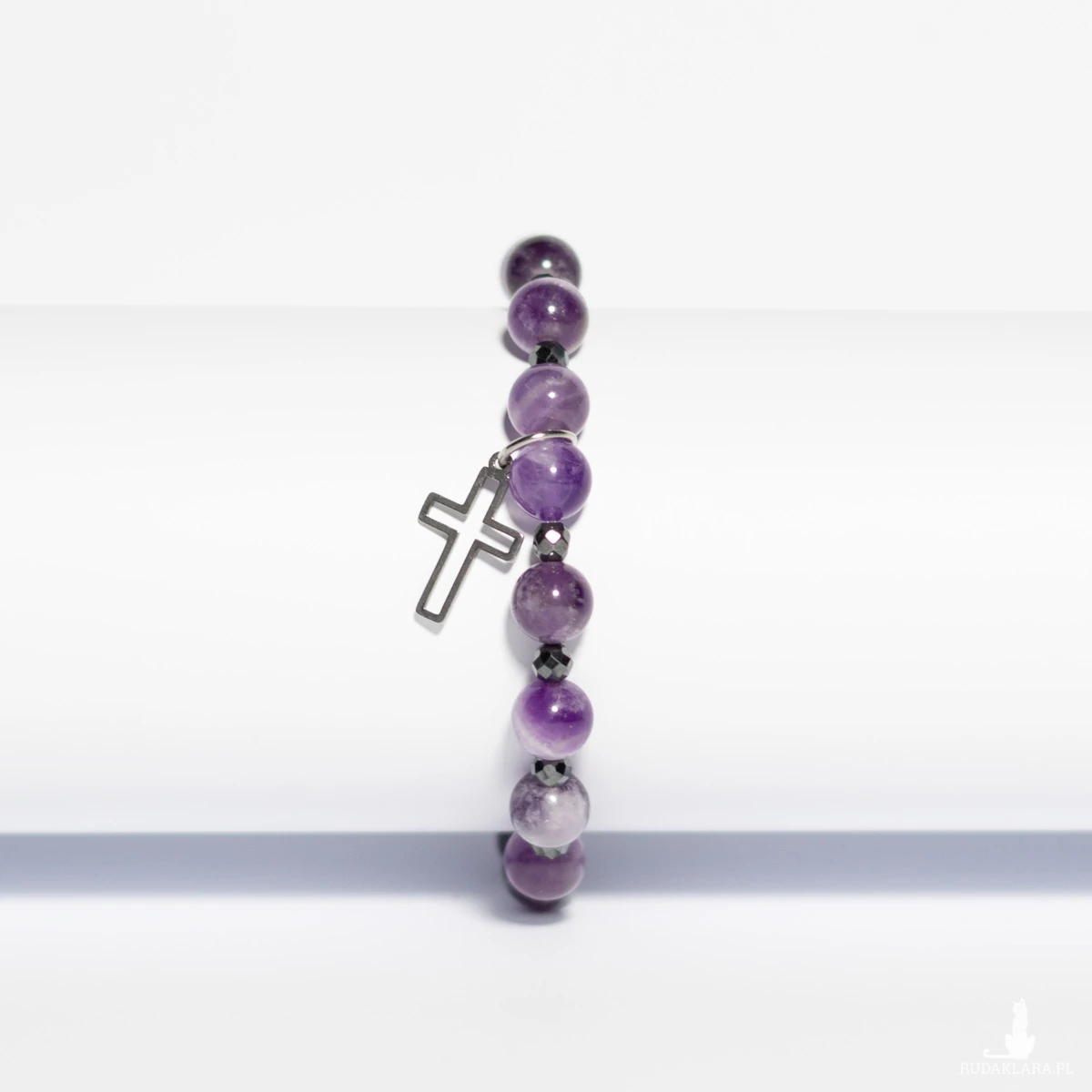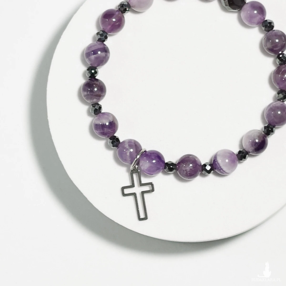 Hematyt natomiast symbolizuje stabilność, odwagę i ochronę, nadając bransoletce wyjątkowy balans między subtelnością a siłą. Krzyżyk ze stali szlachetnej dopełnia całość eleganckim, błyszczącym akcentem o ponadczasowym znaczeniu.