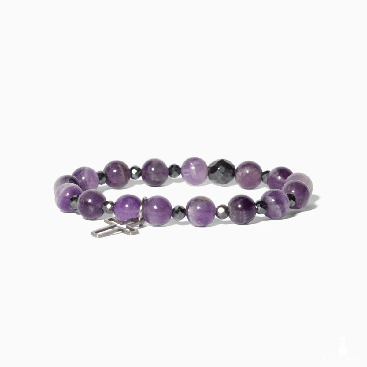 Bransoletka została ręcznie wykonana z naturalnych kamieni, co czyni ją wyjątkową pod względem energii i estetyki. Delikatne odcienie fioletu ametystu współgrają z chłodnym, metalicznym blaskiem hematytu, tworząc harmonijną i elegancką kompozycję.