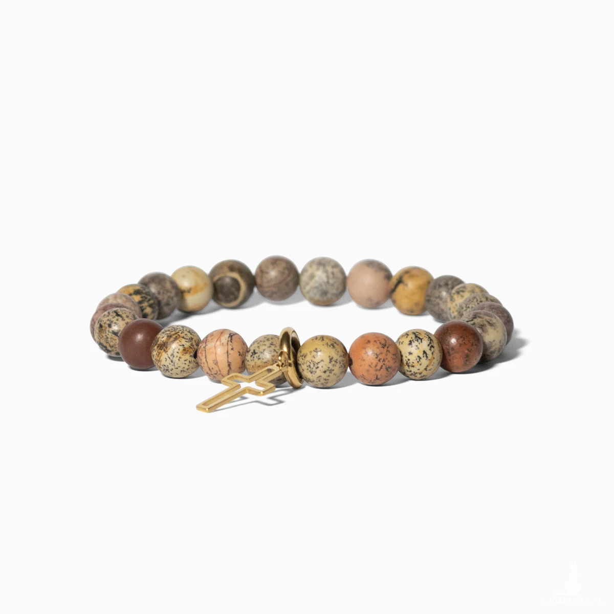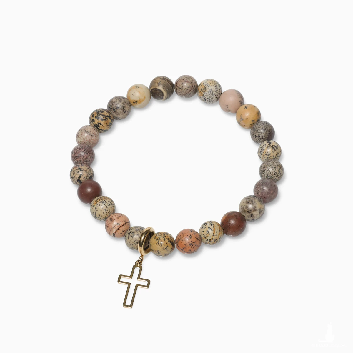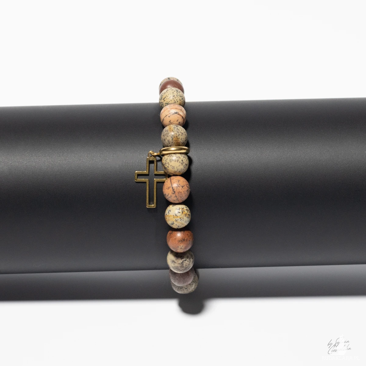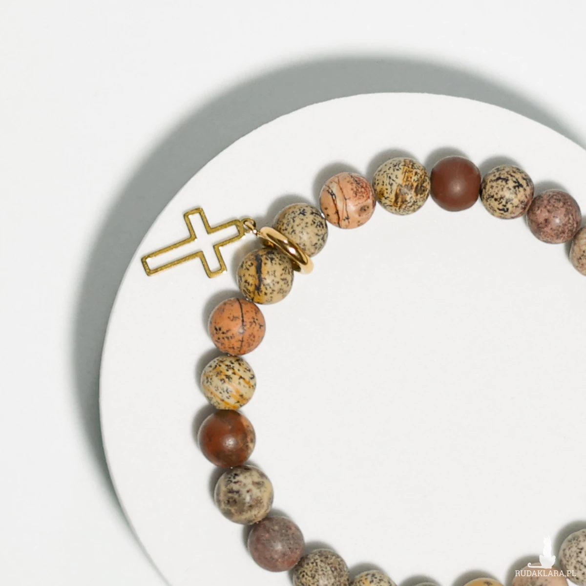 Ciepłe beże, głębokie brązy i czarne żyłki tworzą kompozycję, której nie da się zreplikować. Każdy kamień nosi ślady czasu i natury – żaden nie jest identyczny z drugim. Krzyżyk ze stali szlachetnej dodaje dyskretnego, ale trwałego akcentu – symbol nadziei, siły ducha i własnej drogi.