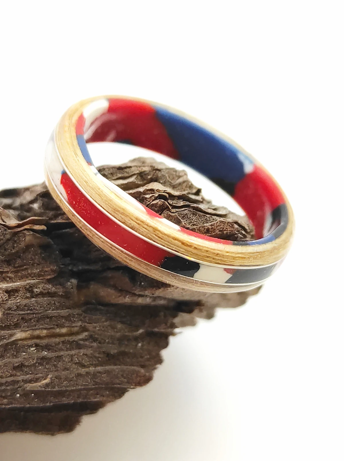 Każdy pierścionek powstaje ręcznie w pracowni Woodrings by Jet. Drewno bukowe zostało starannie dopasowane, a kolorowy celuloid precyzyjnie wkomponowany, tworząc wyjątkowy wzór widoczny zarówno na zewnątrz, jak i wewnątrz pierścionka. Całość zabezpieczona jest specjalną powłoką ochronną, która nadaje gładkość, połysk i odporność na wilgoć.