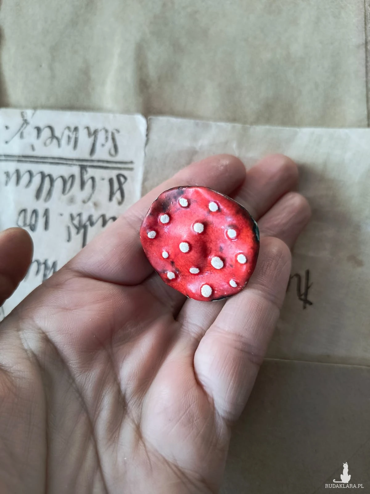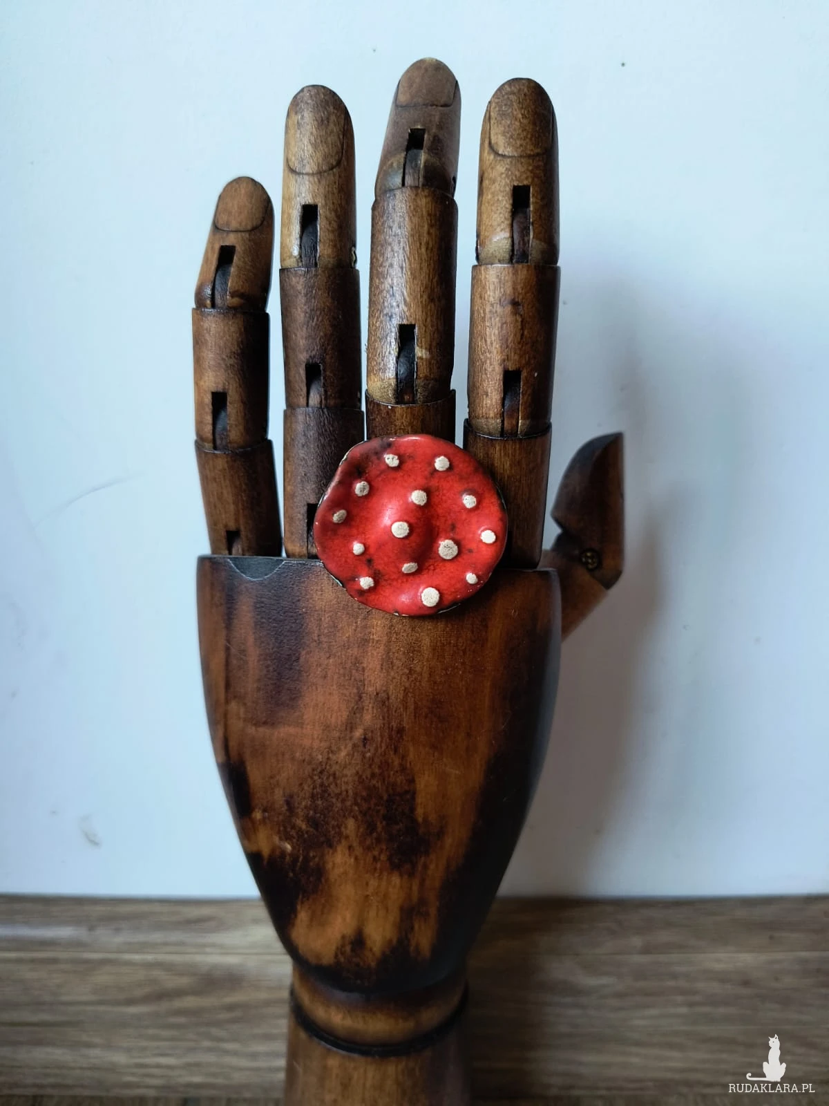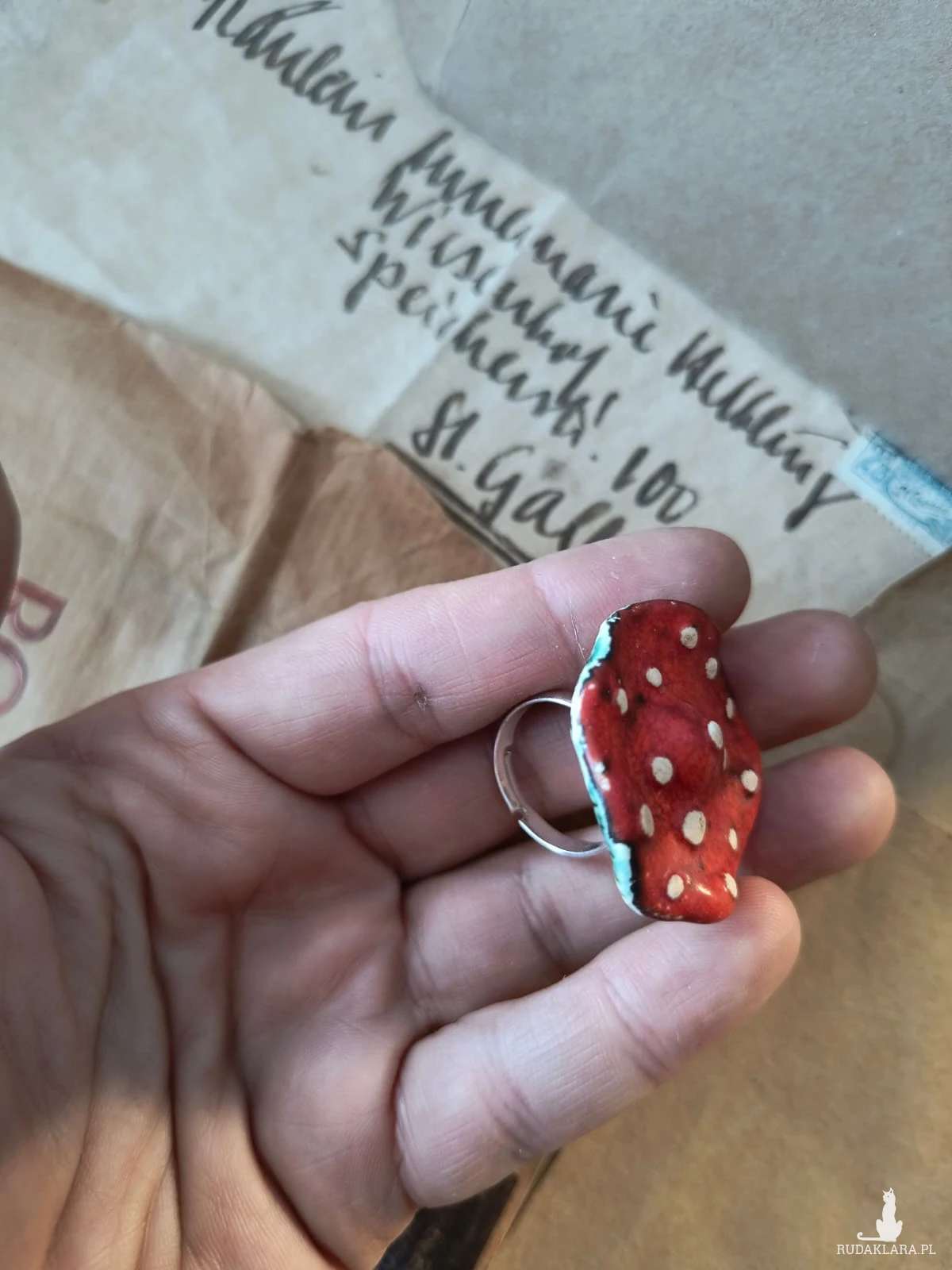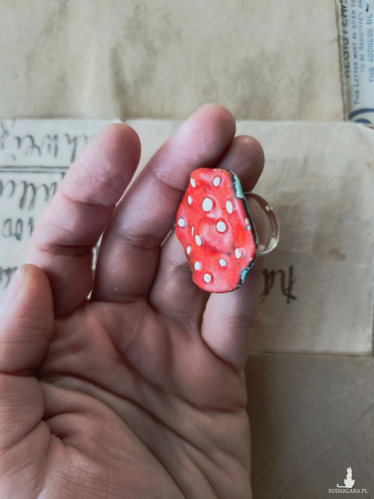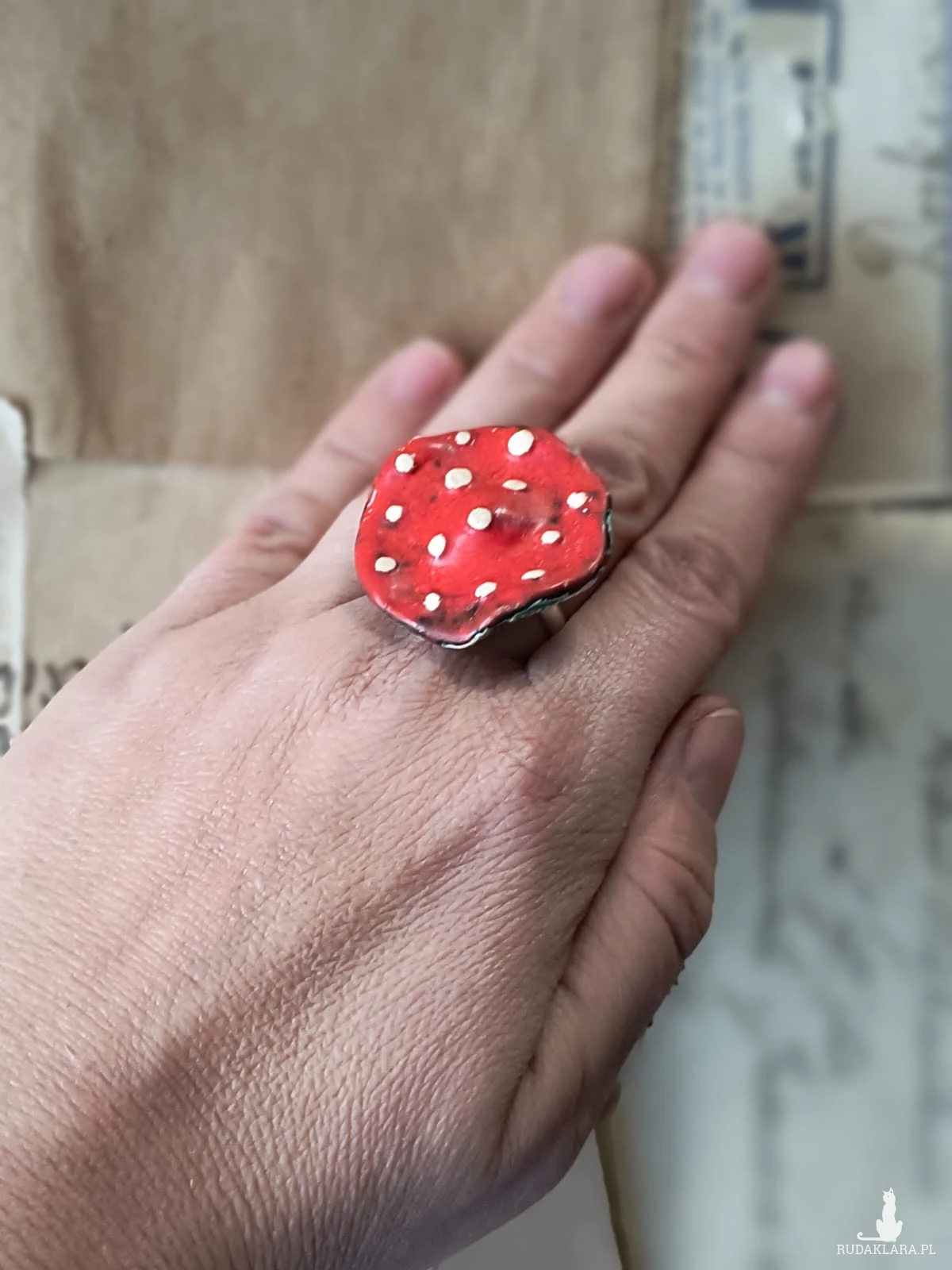 Pierścionek o ceramicznym oku w kształcie muchomora, wykonany z gliny szamotowej, wypalony na biskwit, a następnie szkliwiony w temp. ok 1260 stopni C. Baza do pierścionka w kolorze srebra. Niepowtarzalny i jedyny w swoim rodzaju. Wymiary ok 3,5 cm x 3,5 cm. Obwód pierścionka jest regulowany. Serdecznie polecam wszystkim Paniom!!!