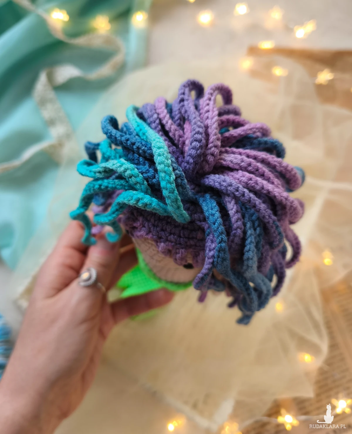 • Włosy wyszydełkowane są z włóczki wielobarwnej, kolory - odcienie niebieskiego i fioletowego.