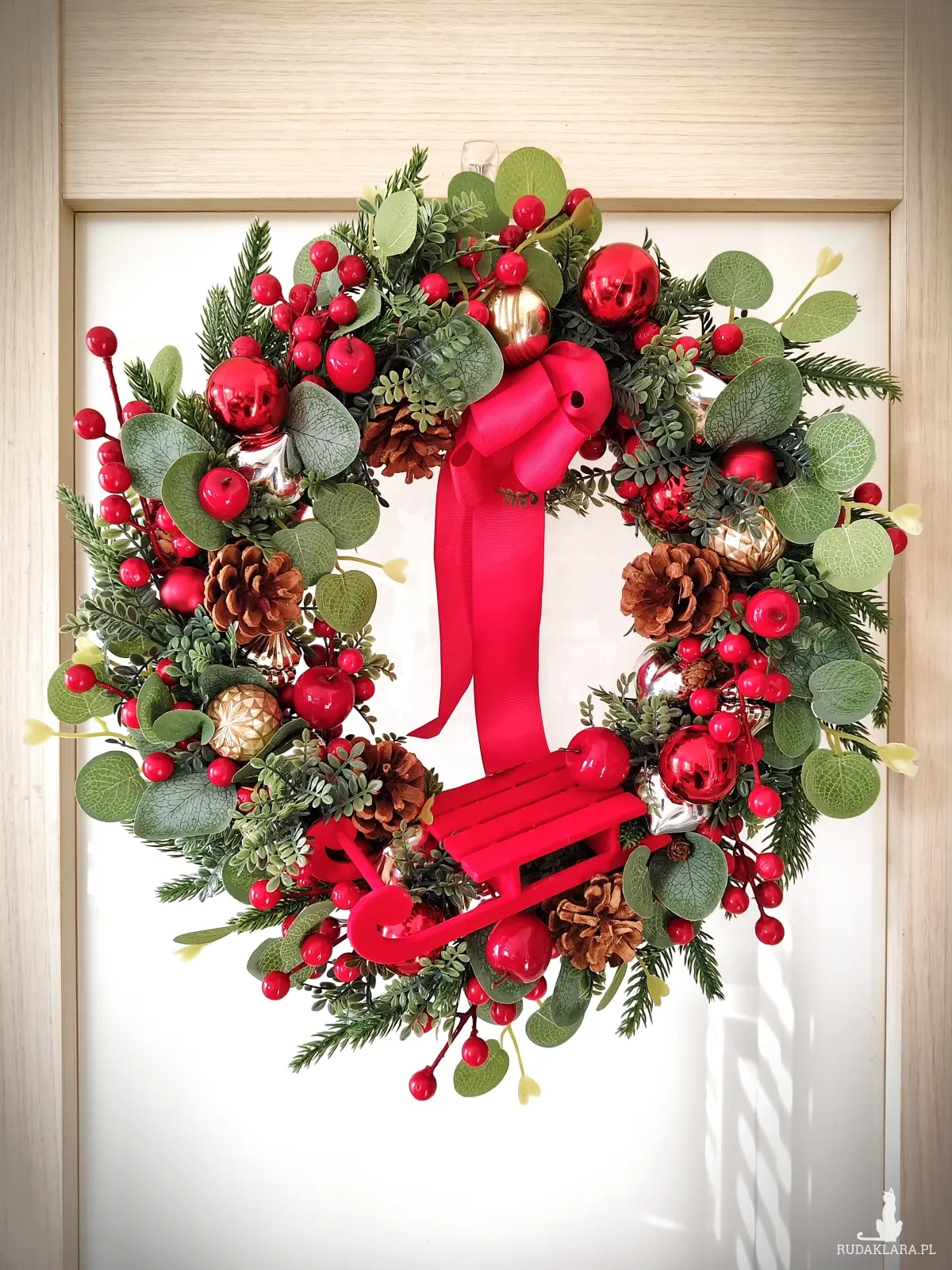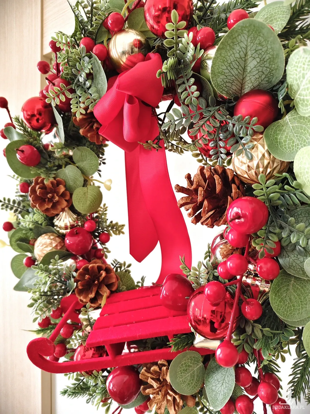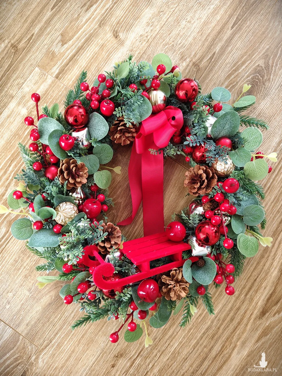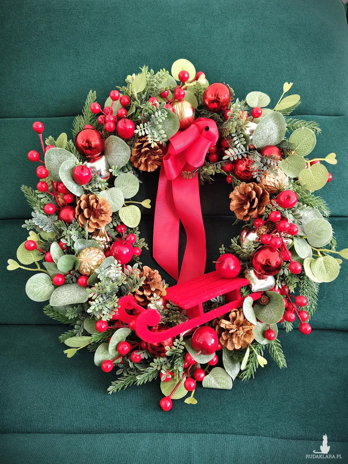 Świąteczny sztuczny wianek został wykonany z gałązek wysokiej jakości. W roli głównej urocze czerwone sanki) Ozdobiony szyszkami, owocami glogu, jabłuszkami i bombkami w odcieniach czerwieni, srebra i złota.
