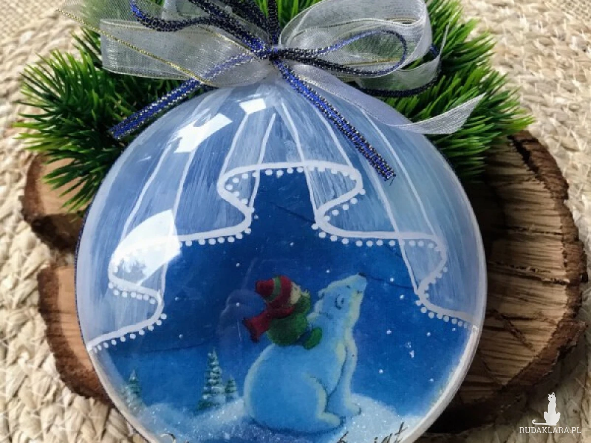 Bombka - medalion, Decoupage miś to propozycja dla osób, które lubią nietypowe ozdoby świąteczne. Wykonana jest w technice decoupage, która pozwala na uzyskanie naprawdę ciekawych efektów dekoracyjnych. Bombkę możesz wykorzystać do ozdobienia drzewka bożonarodzeniowego. Dobrze będzie prezentować się ona również na specjalnym stojaku, który zostanie postawiony na wigilijnym stole. średnica medalionu 11 cm.Na zdjęciach pokazano dwie strony bombki medalionu.W tej postaci produkt gotowy do natychmiastowej wysyłki.
