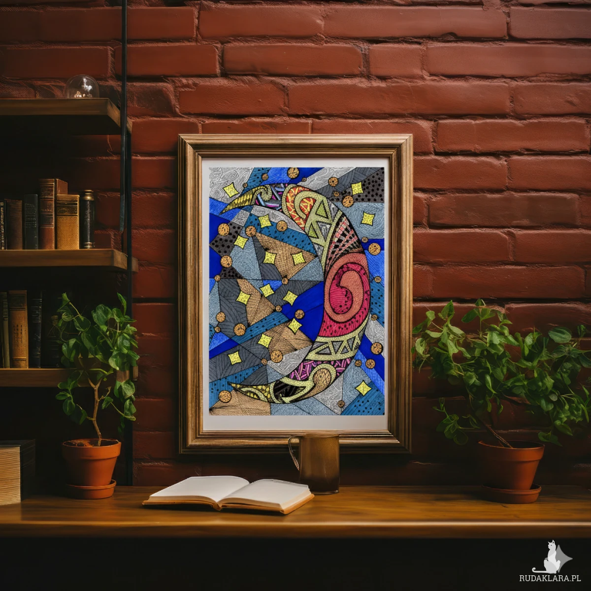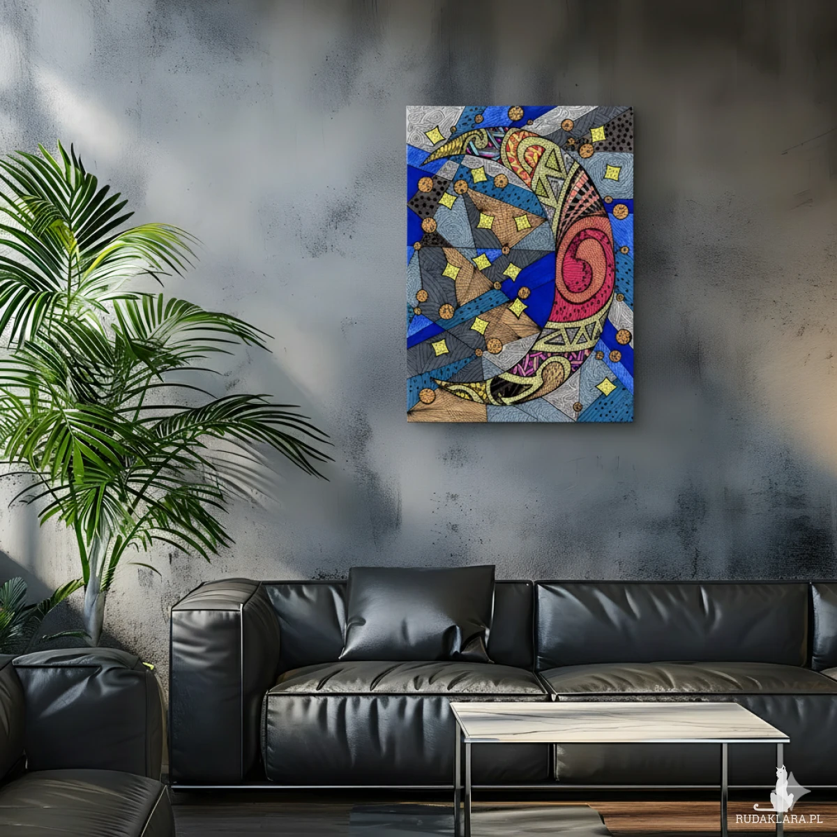 Intensywna, geometryczna ilustracja przedstawiająca mocno stylizowany, zakrzywiony Księżyc w otoczeniu gwiazd i chmur. Kompozycja charakteryzuje się gęstą fragmentacją tła w odcieniach błękitu, szarości i brązu, które są podzielone na nieregularne, teksturowane segmenty.