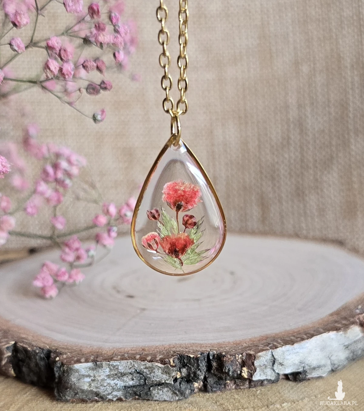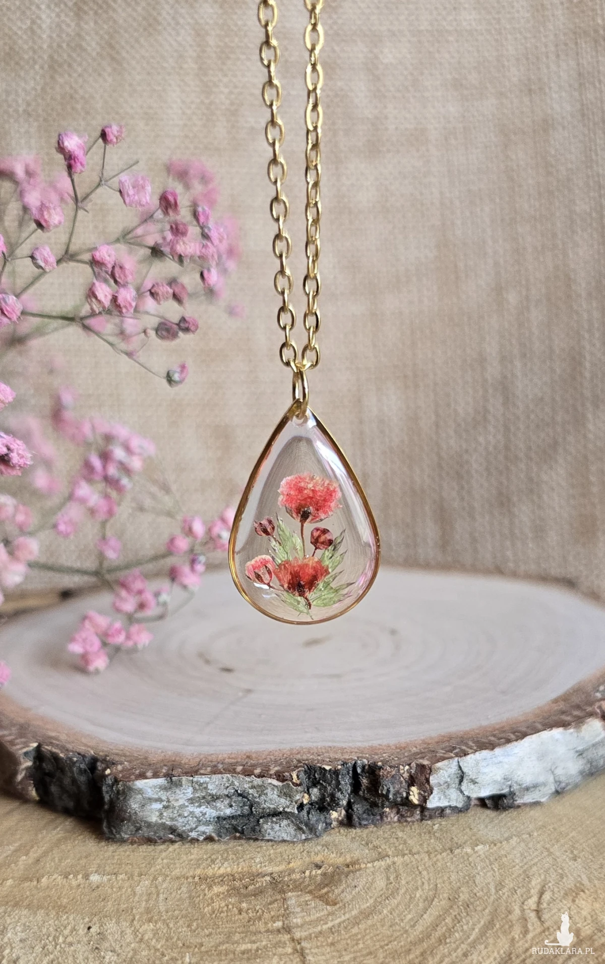 Oferuję Państwu unikalną biżuterię. Zawieszka jest wykonana z suszonych kwiatów i żywicy epoksydowej. Biżuteria jest wspaniałym i oryginalnym prezentem na lata.