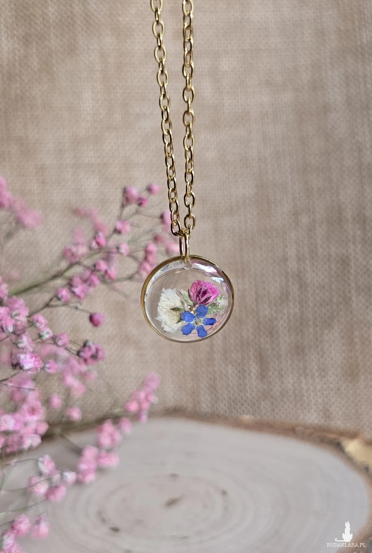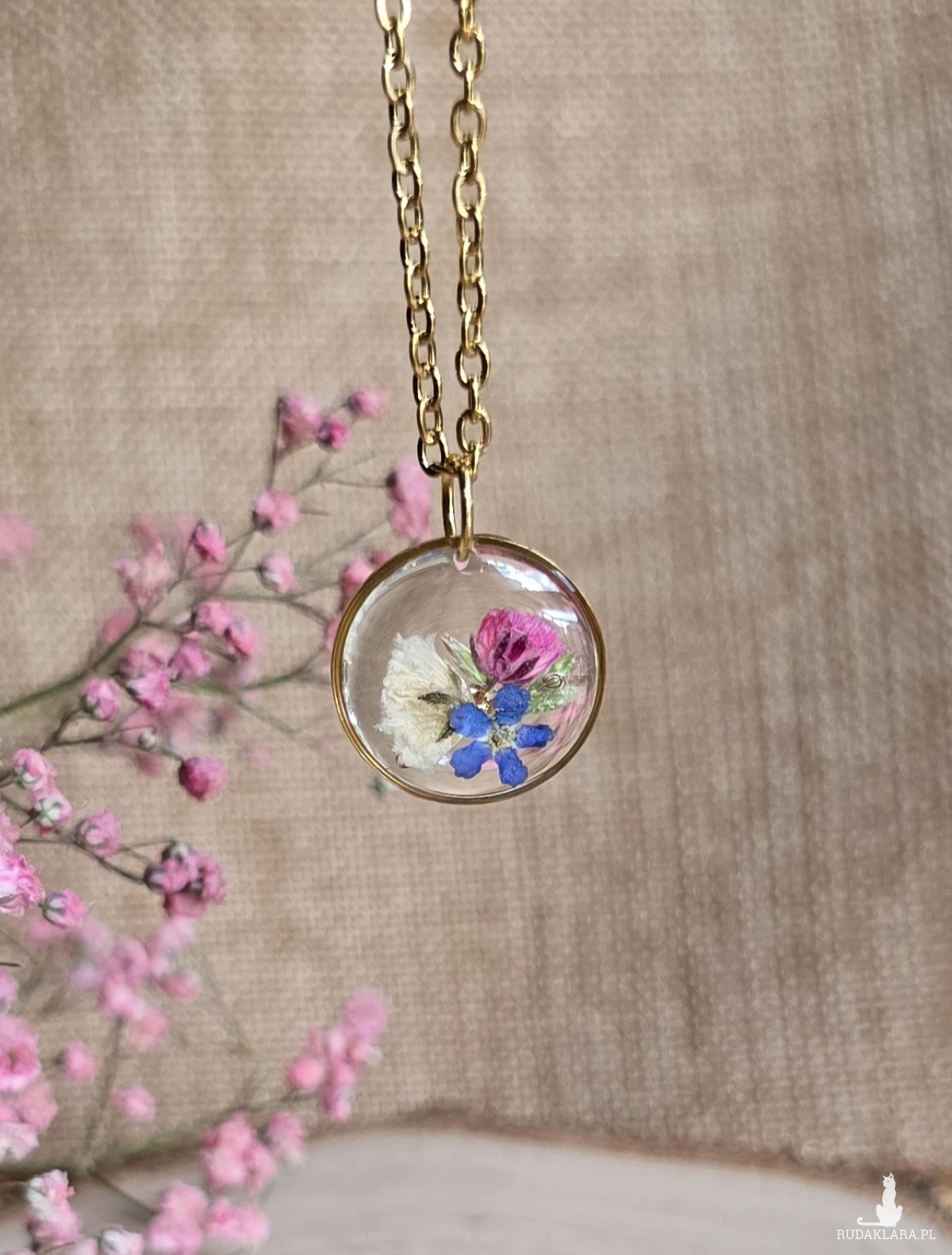 złota zawieszka złoty wisiorek naszyjnik żywica z żywicy kwiaty z kwiatami retro naturalna dziewczęca kobieca różowa gipsówka niezapominajka