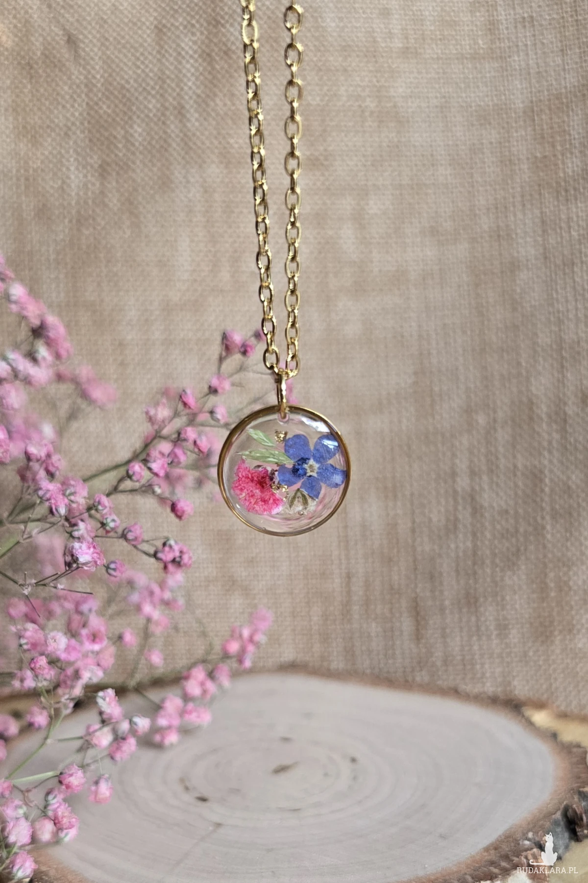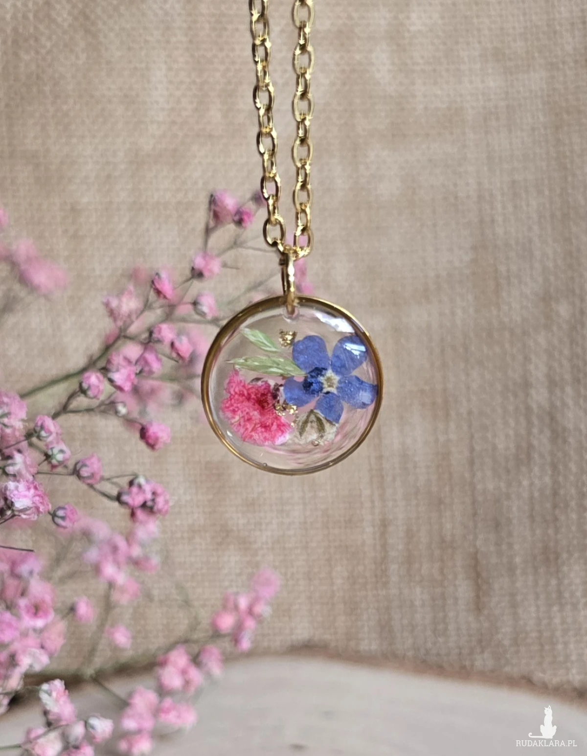 Oferuję Państwu unikalną biżuterię. Zawieszka jest wykonana z suszonych kwiatów i żywicy epoksydowej. Biżuteria jest wspaniałym i oryginalnym prezentem na lata.