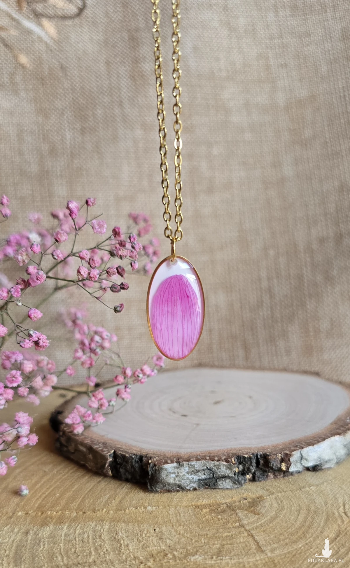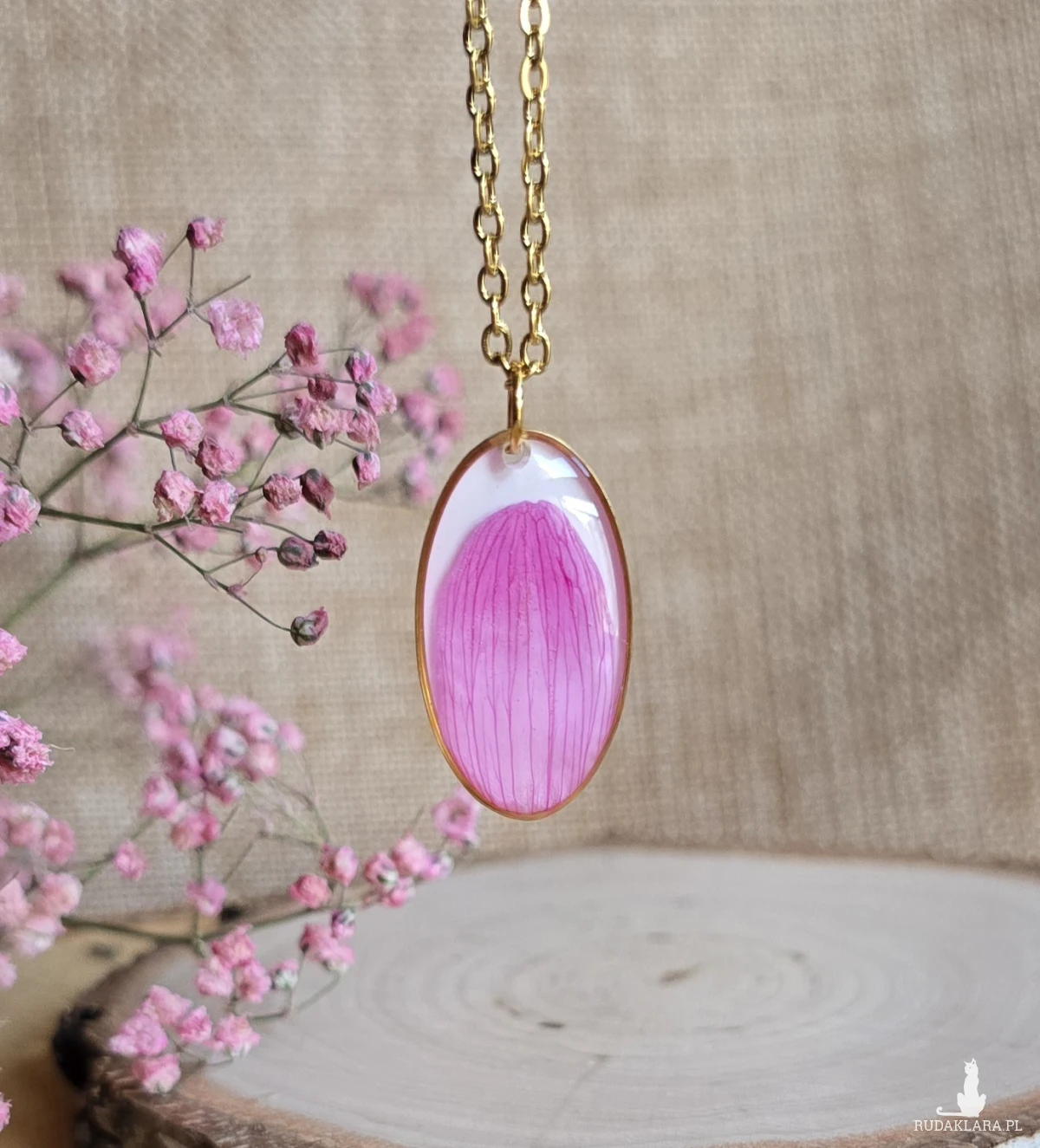 Oferuję Państwu unikalną biżuterię. Zawieszka jest wykonana z suszonych kwiatów i żywicy epoksydowej. Biżuteria jest wspaniałym i oryginalnym prezentem na lata.
