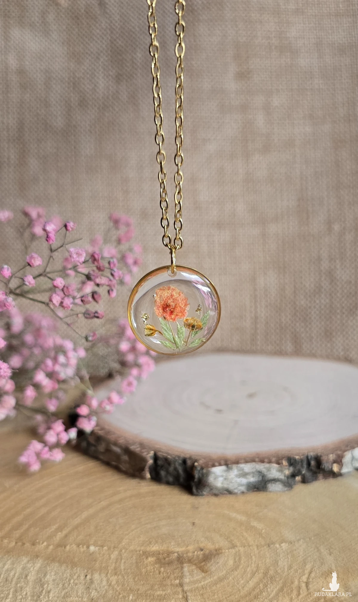 Oferuję Państwu unikalną biżuterię. Zawieszka jest wykonana z suszonych kwiatów i żywicy epoksydowej. Biżuteria jest wspaniałym i oryginalnym prezentem na lata.