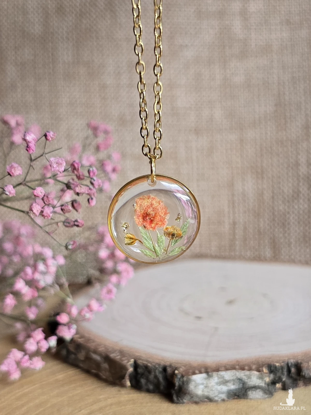Wieczne kwiaty złota zawieszka złoty wisiorek naszyjnik żywica z żywicy kwiaty z kwiatami retro naturalna dziewczęca kobieca pomarańczowa gipsówka