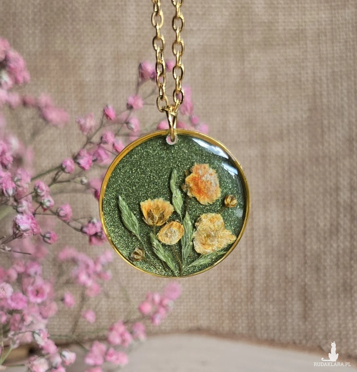 Oferuję Państwu unikalną biżuterię. Zawieszka jest wykonana z suszonych kwiatów i żywicy epoksydowej. Biżuteria jest wspaniałym i oryginalnym prezentem na lata.