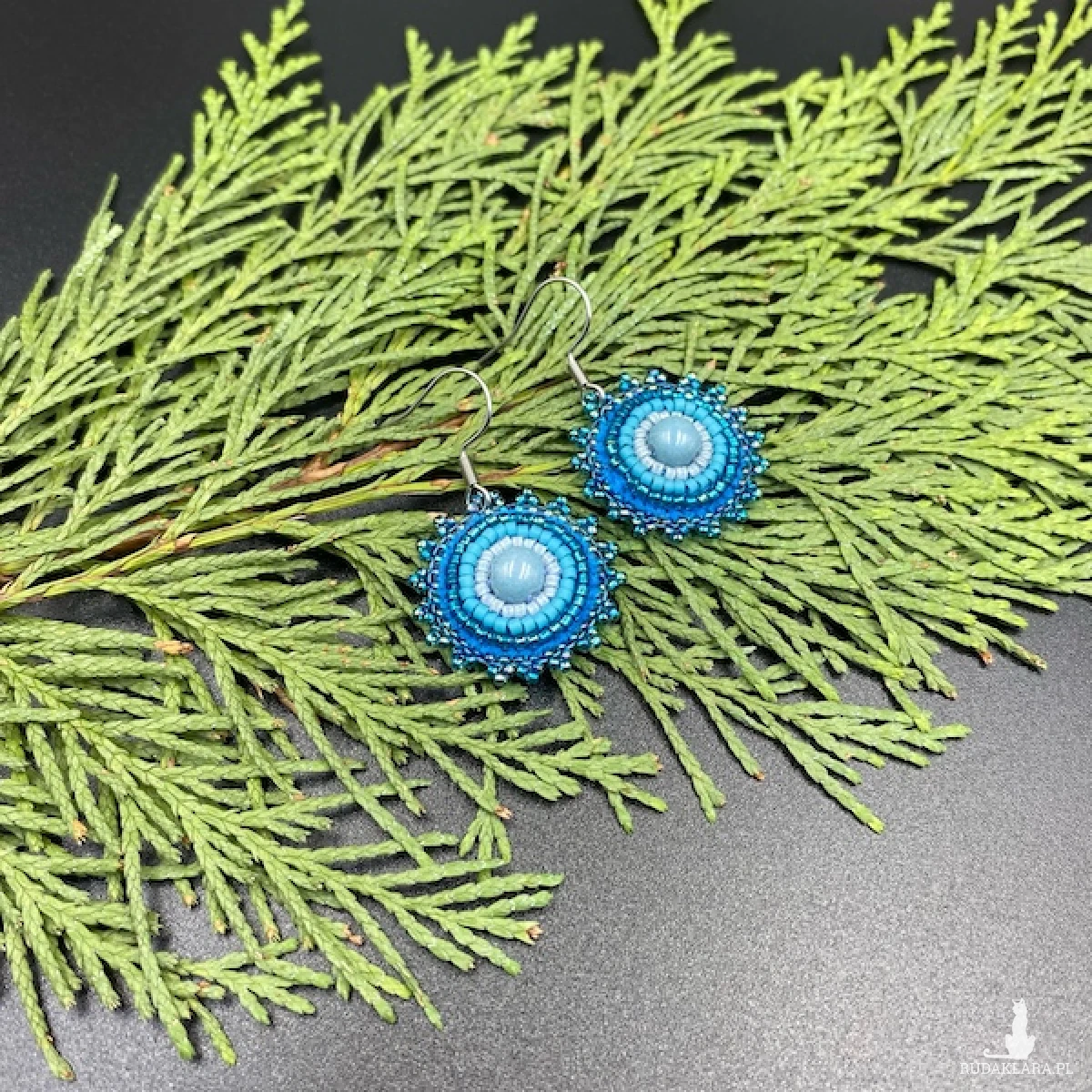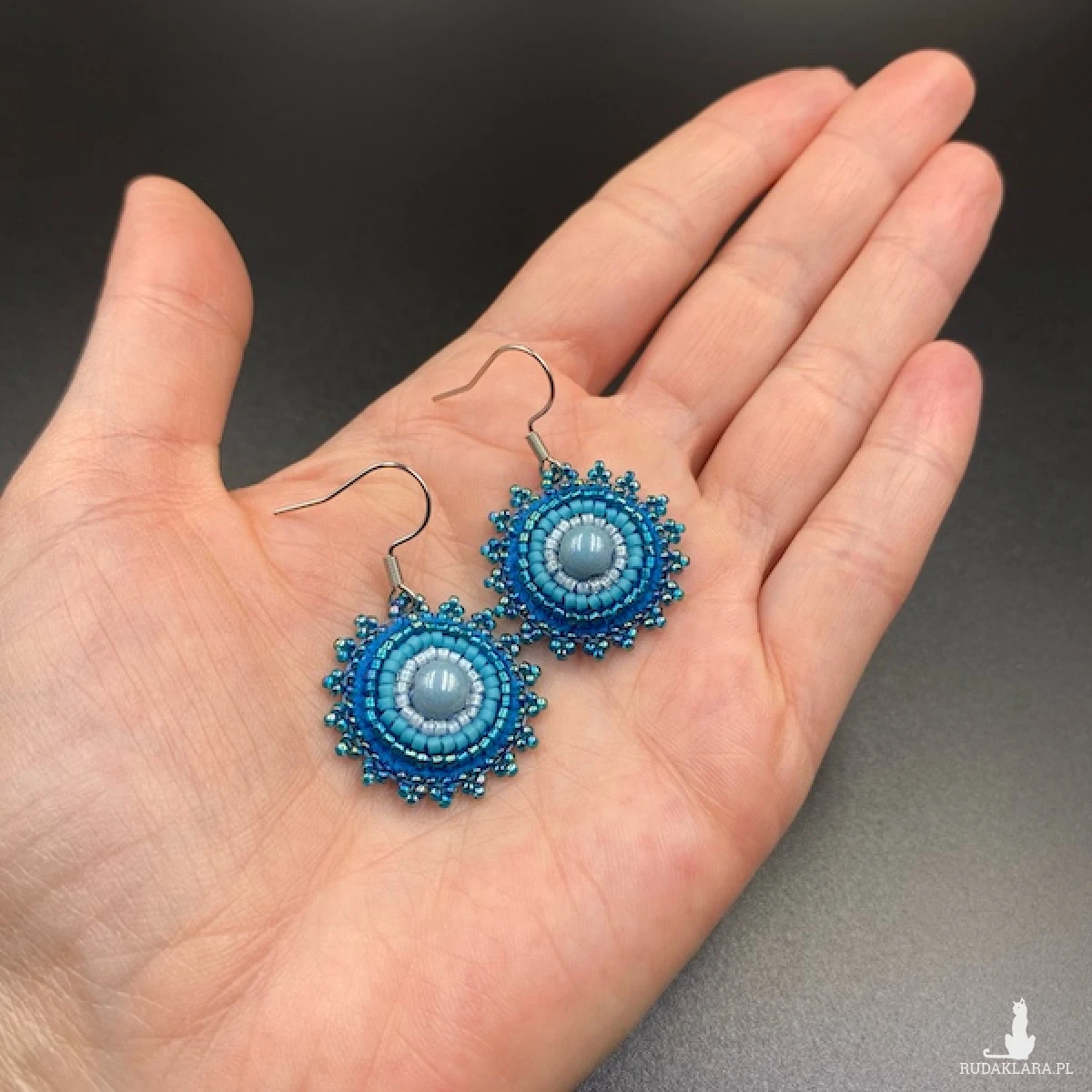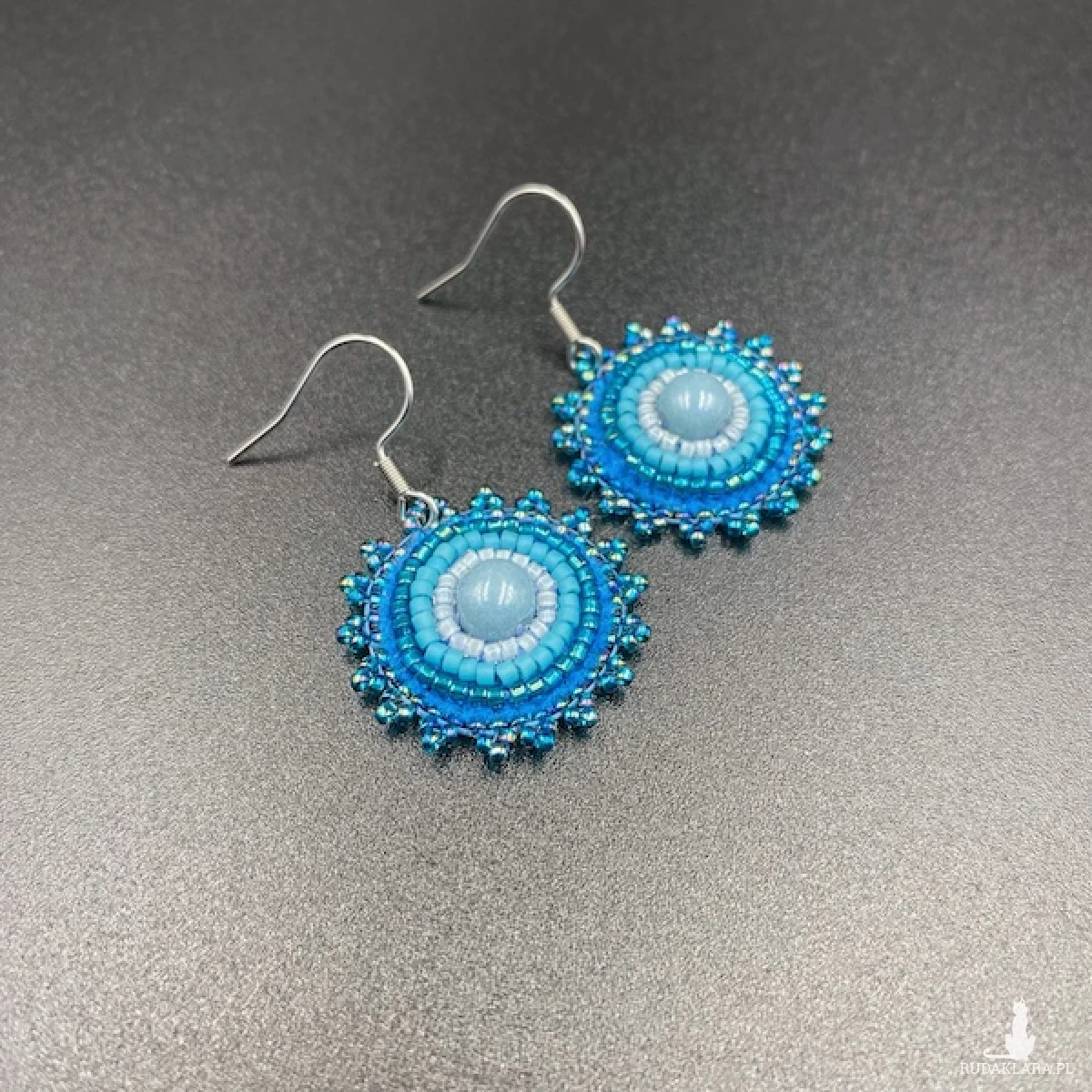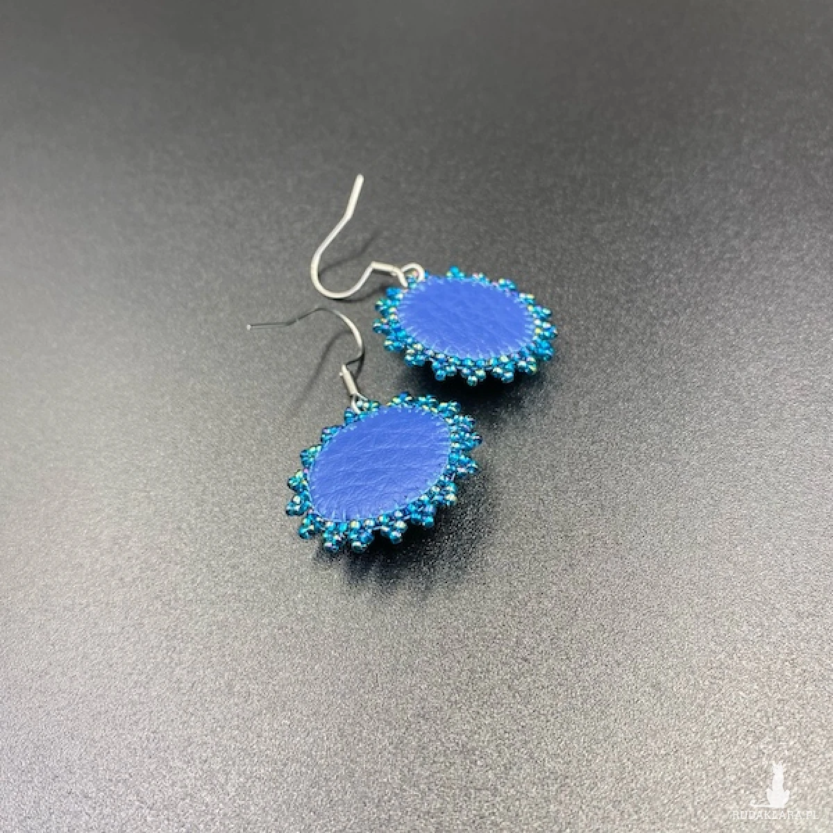 Okrągłe, małe kolczyki wykonane zostały techniką haftu koralikowego z drobnych koralików Toho i Miyuki, w 100% wyszyte ręcznie. Spód kolczyków podszyty jest ciemno niebieską eko skórką. Bigle otwarte ze stali chirurgicznej.