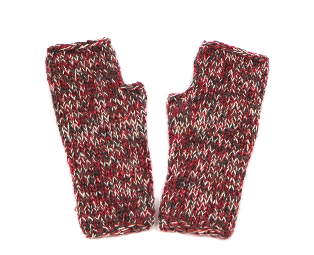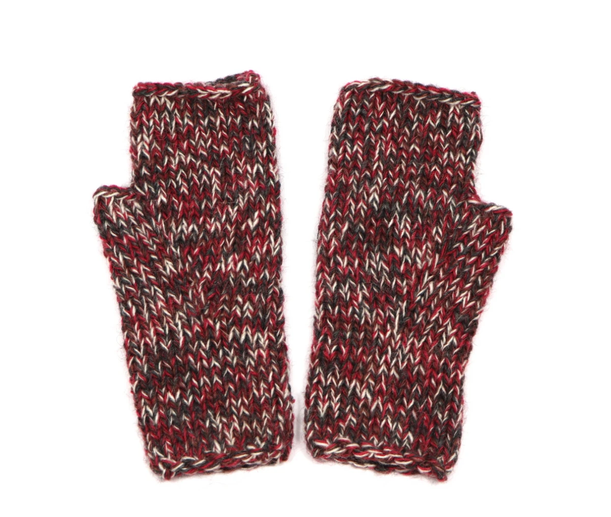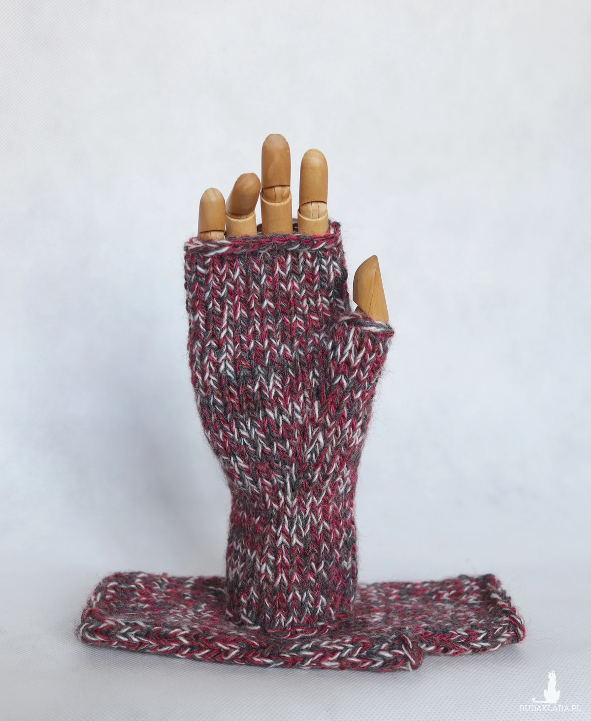 Cieplutkie bezszwowe mitenki zrobione na drutach z czterech nitek włóczki w kolorach: ecru, bordowy, grafitowy i ciemnobrązowy.
