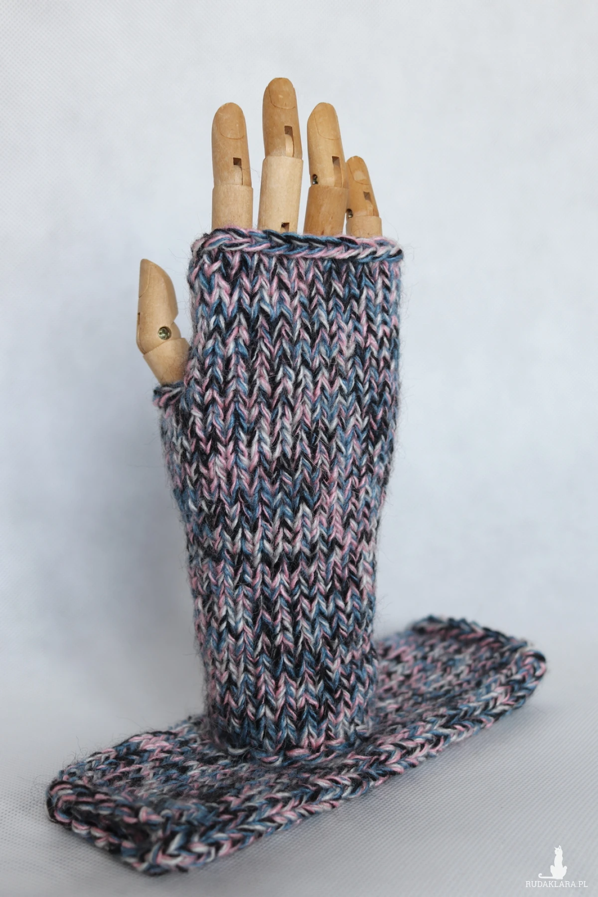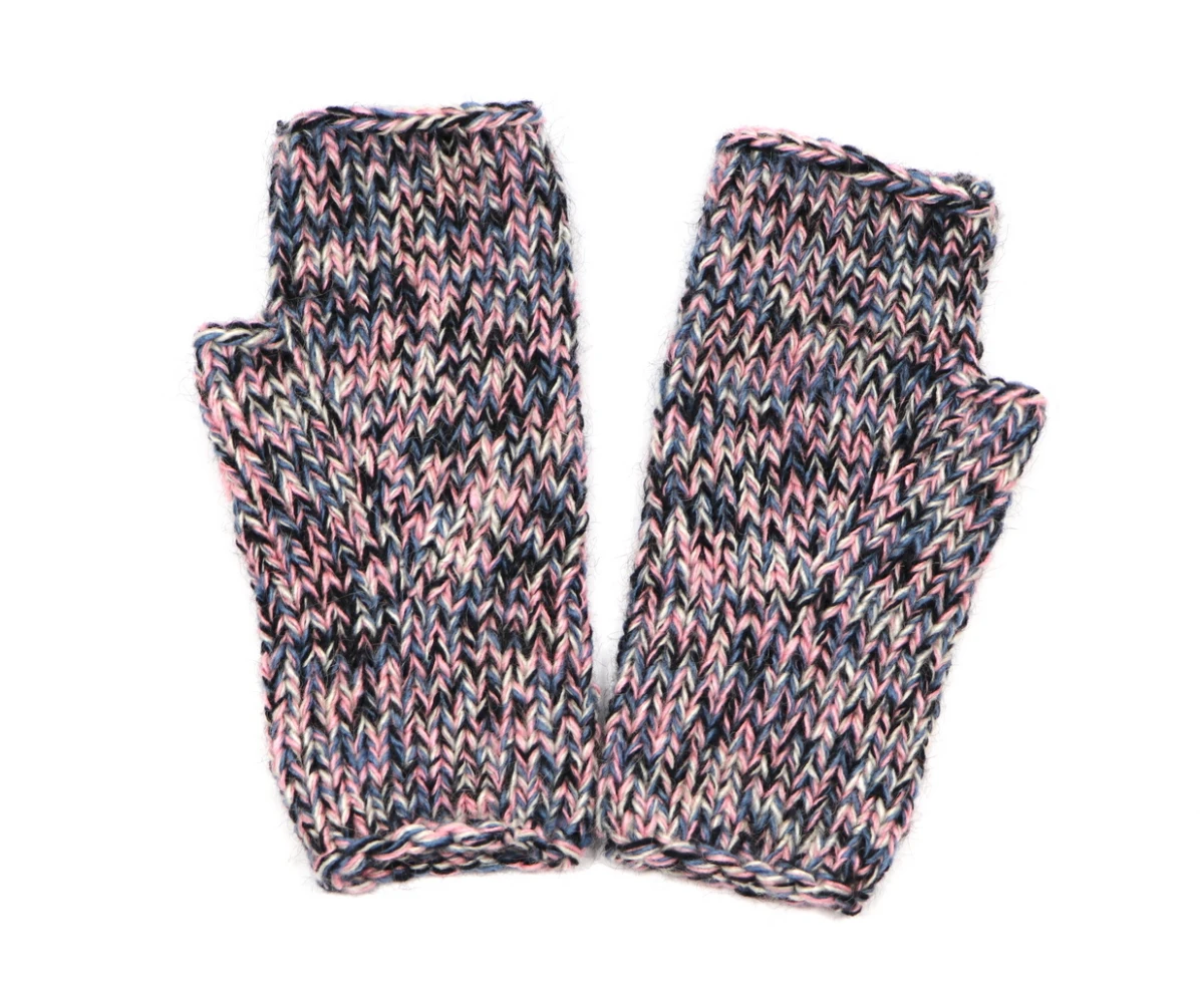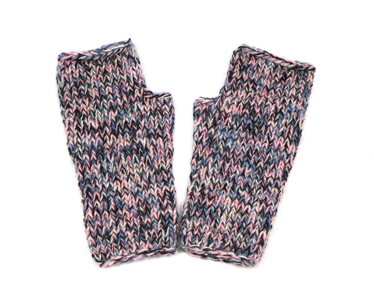 Cieplutkie bezszwowe mitenki zrobione na drutach z czterech nitek włóczki w kolorach: jasnoróżowy, ecru, jeansowy i czarny.