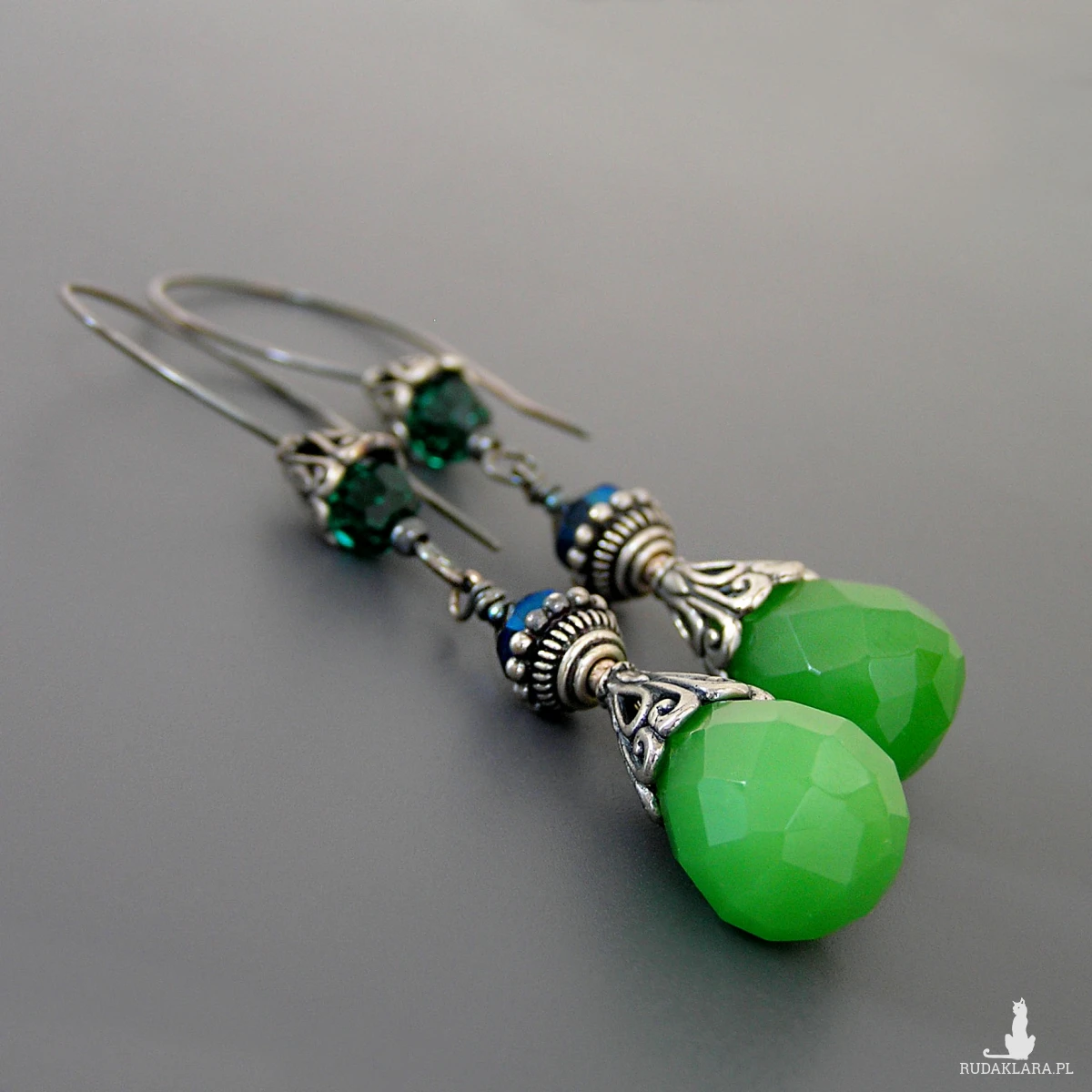 Kolczyki retro z kroplami jadeitu o wymiarach 18 x 12 mm i kryształkami w kolorze zielonym i granatowym o wymiarach 6 x 6 mm.
