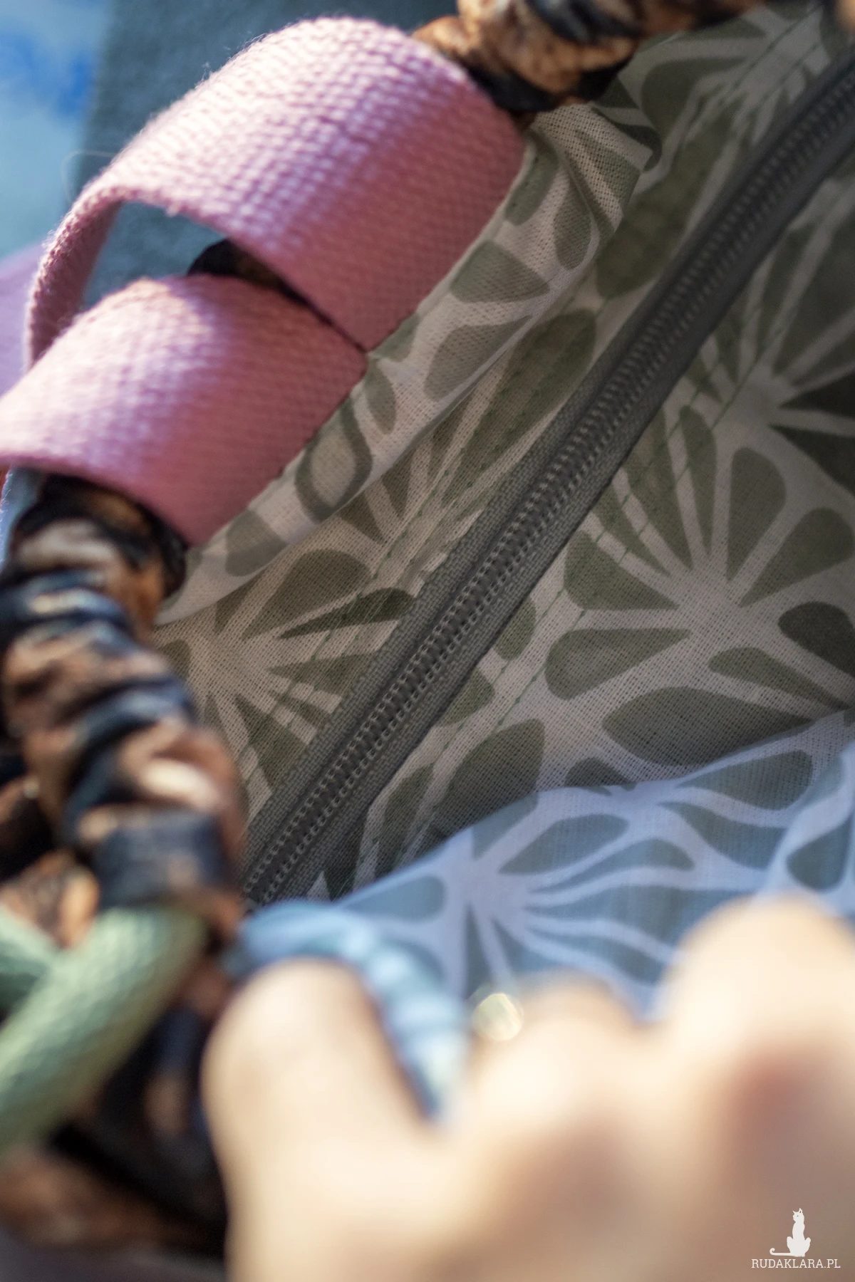 Workoplecak posiada regulowane, bawełniane paski grubości 3cm w kolorze różowym.