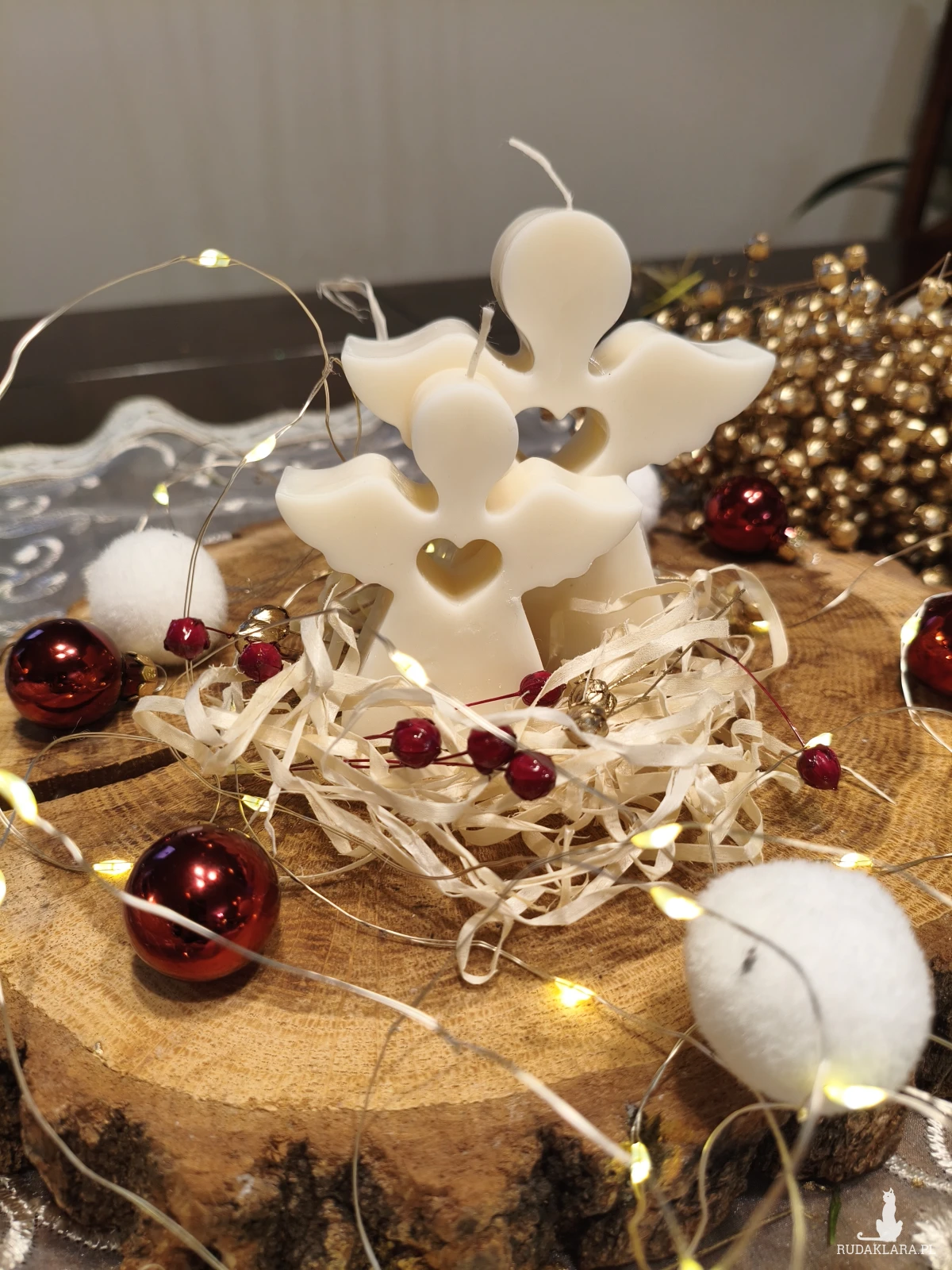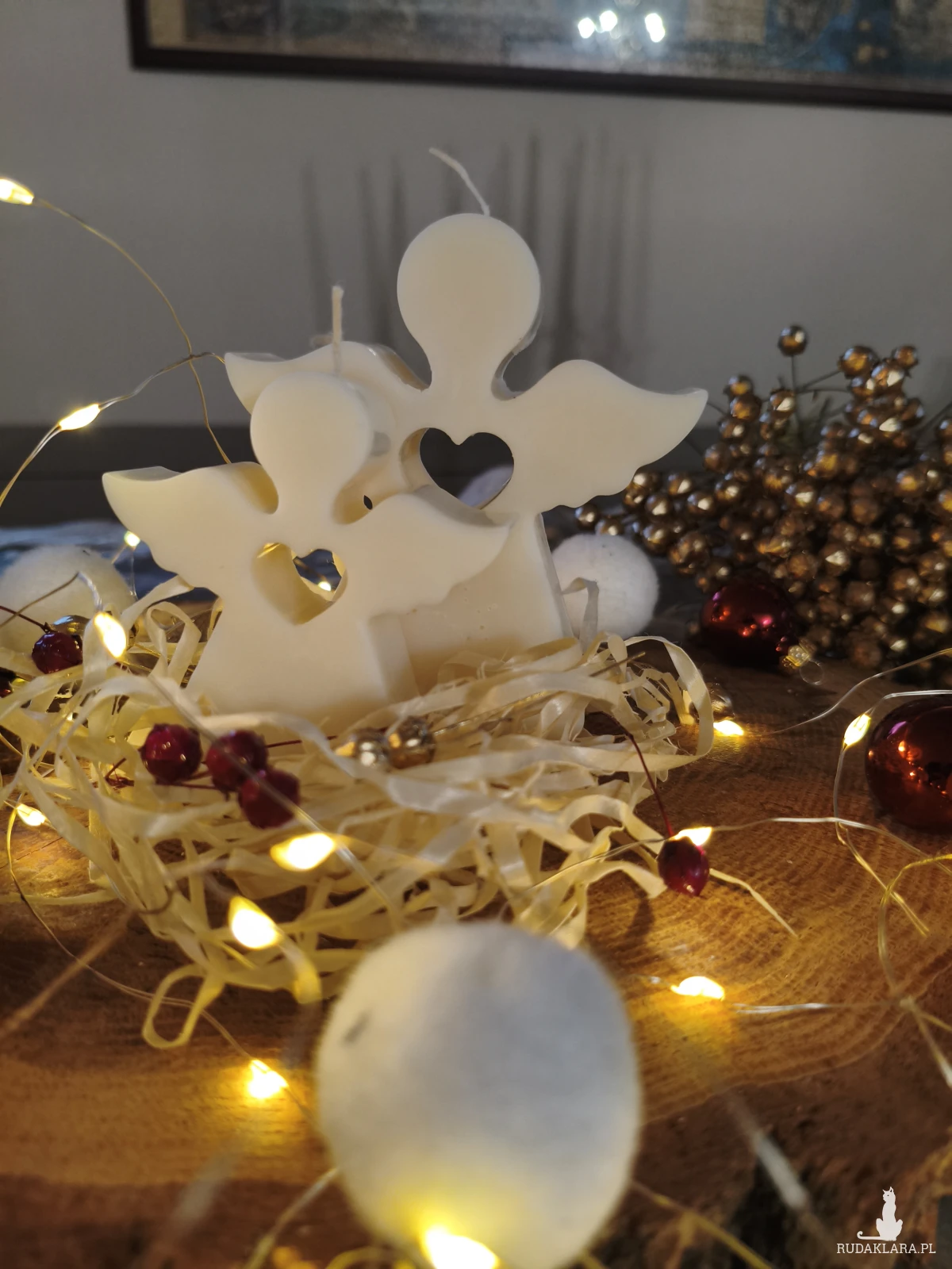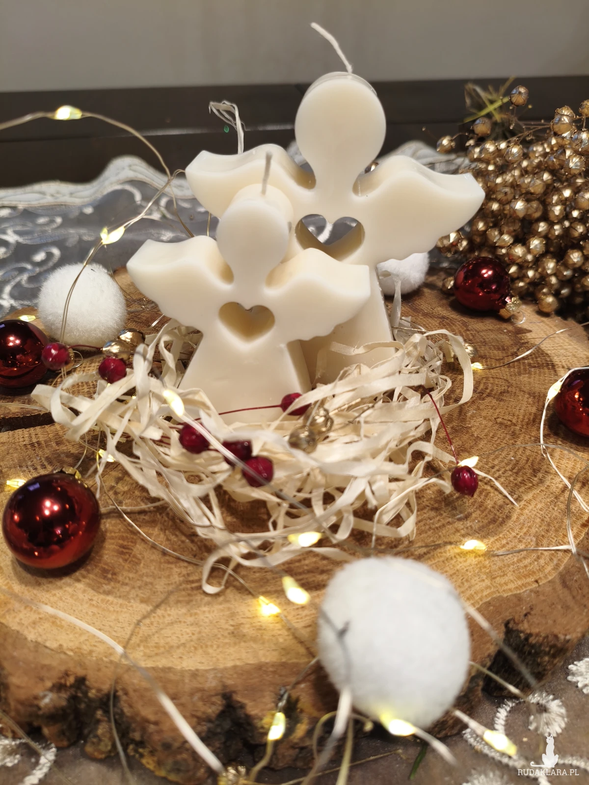 Gramatura świec 150 g wysokość dużego anioła 10 cm mniejszego 8 cm.