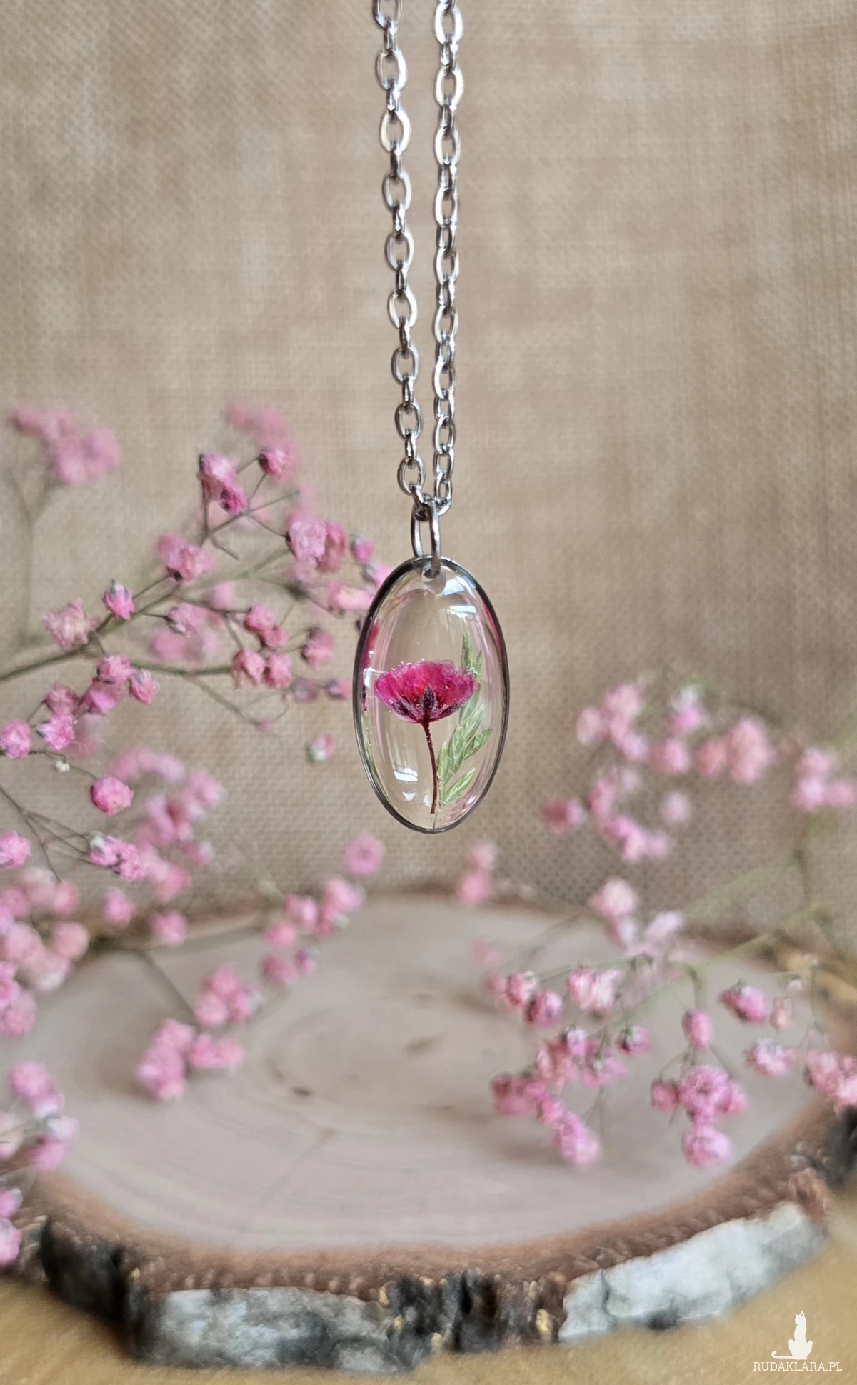 Oferuję Państwu unikalną biżuterię. Zawieszka jest wykonana z suszonych kwiatów i żywicy epoksydowej. Biżuteria jest wspaniałym i oryginalnym prezentem na lata.