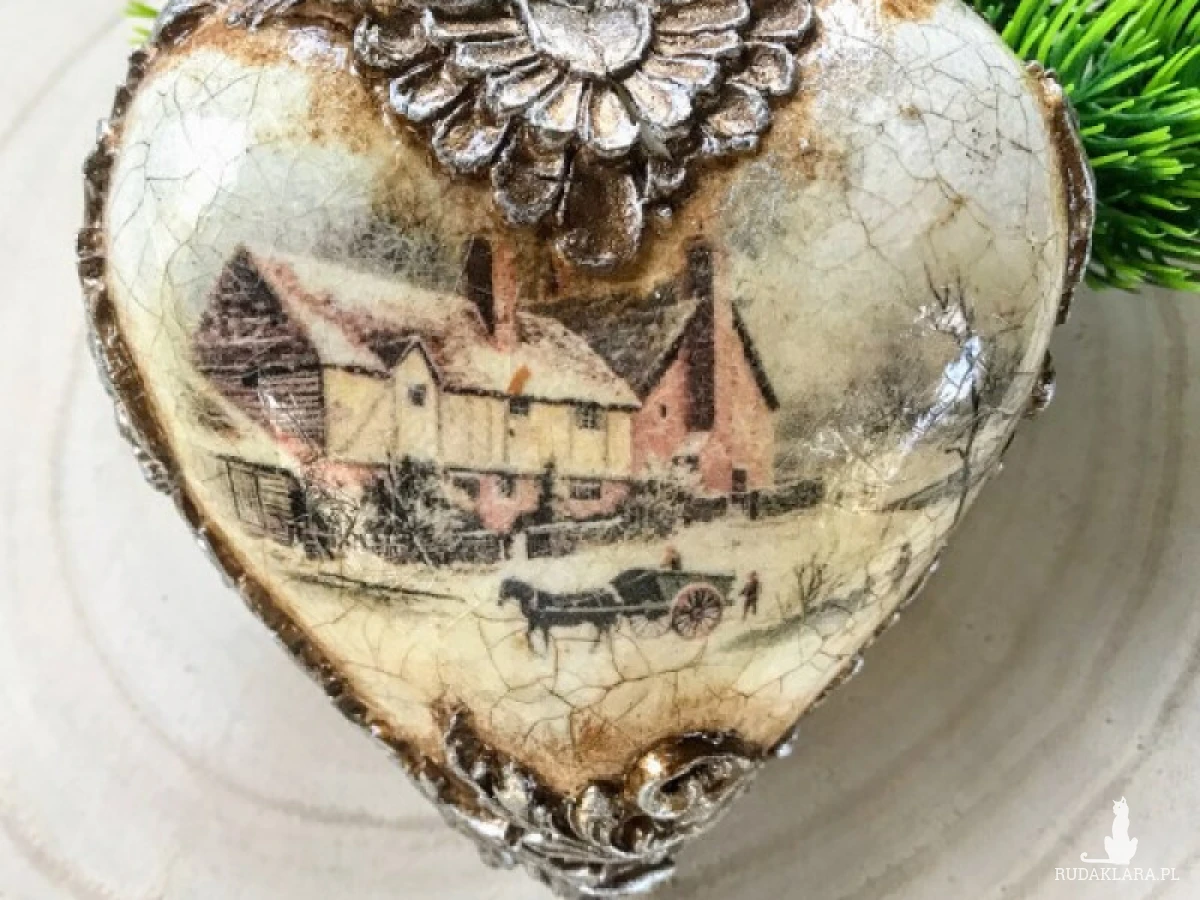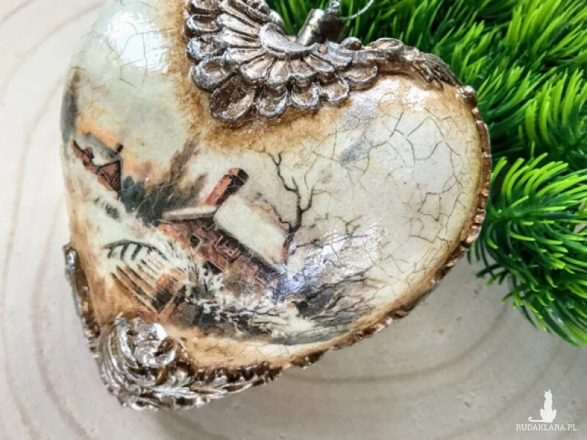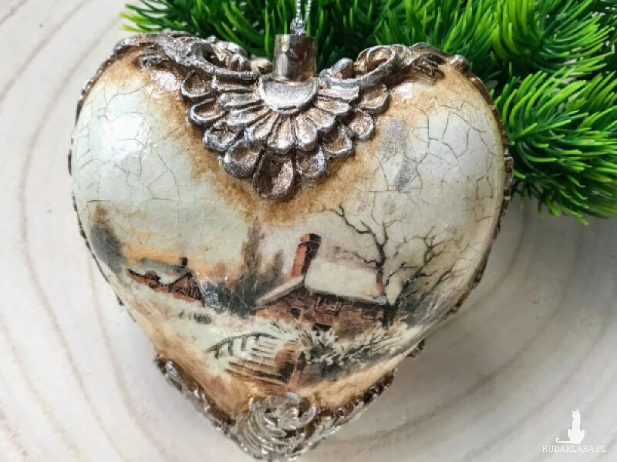 Bombka - w kształcie serca, z pięknym, rozrzeźbionym ornamentem, i postarzającymi spękaniami oraz obrazkami vintage.To propozycja dla osób, które lubią nietypowe ozdoby świąteczne. Wykonana jest w technice decoupage, która pozwala na uzyskanie naprawdę ciekawych efektów dekoracyjnych. Bombkę możesz wykorzystać do ozdobienia drzewka bożonarodzeniowego. Dobrze będzie prezentować się ona również na specjalnym stojaku, który zostanie postawiony na wigilijnym stole. Wielkość serca 10 cm. Na zdjęciach pokazano dwie strony bombki serca. W tej postaci produkt gotowy do natychmiastowej wysyłki.