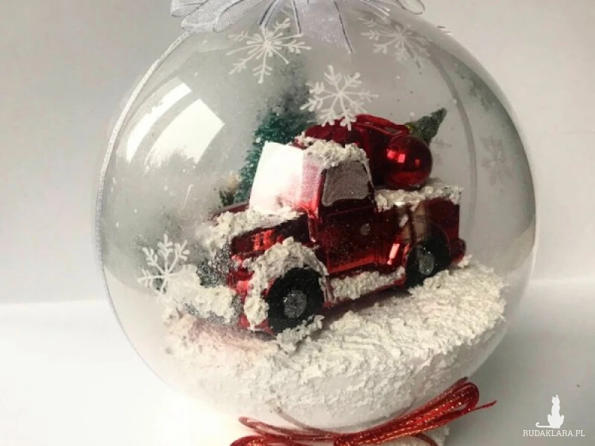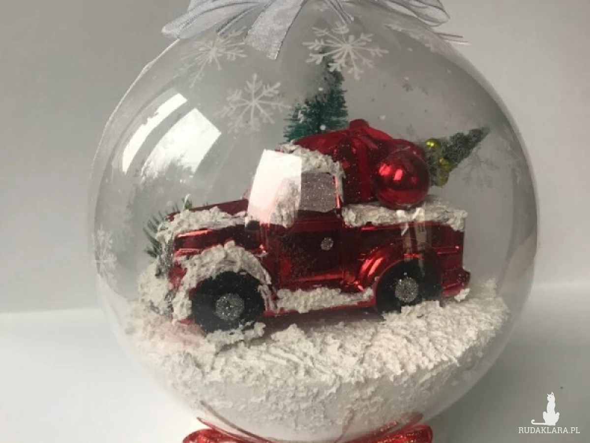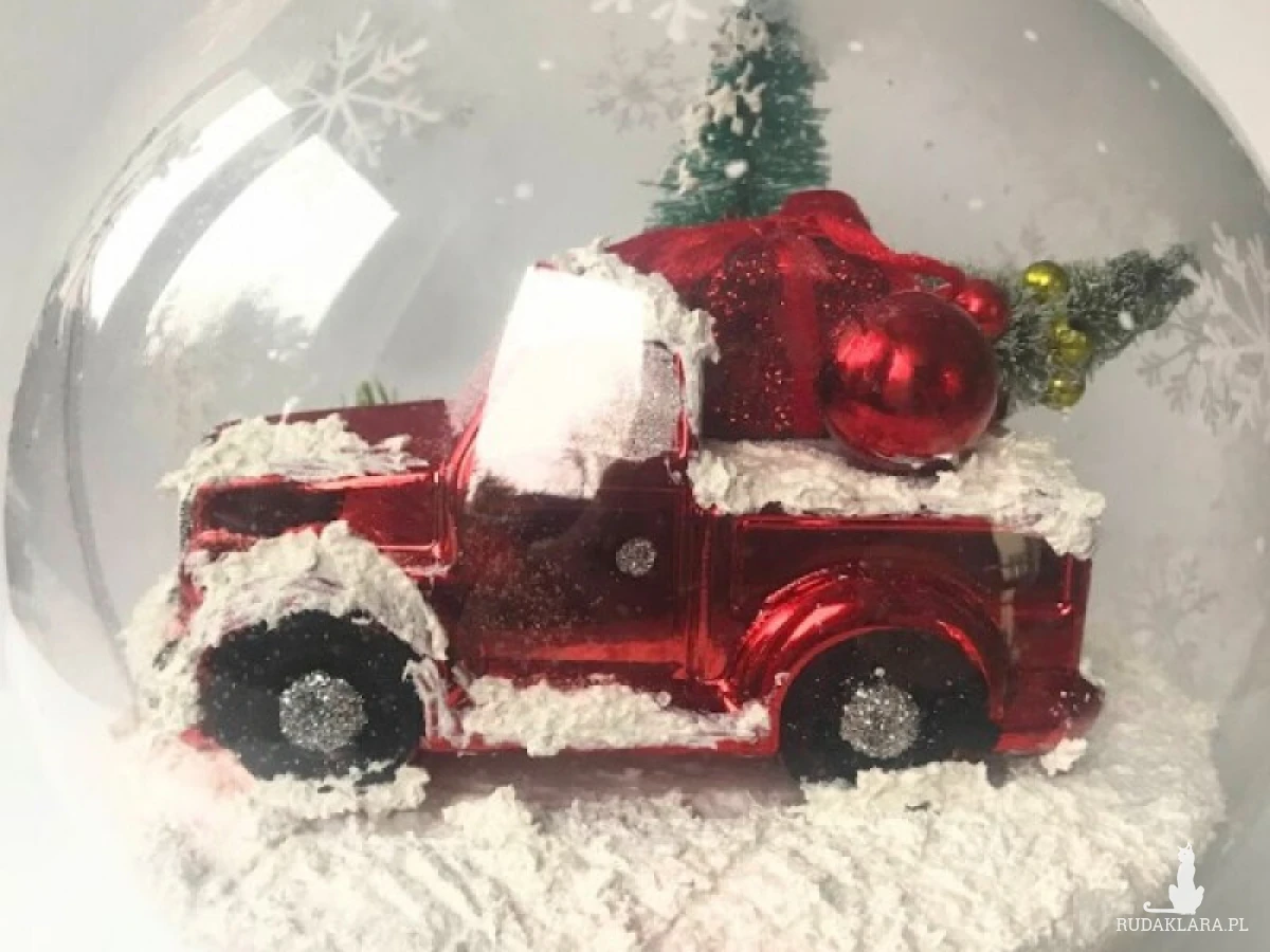 Bombka - kula z samochodem retro. To propozycja dla osób, które lubią nietypowe ozdoby świąteczne. Wykonana jest w technice decoupage, która pozwala na uzyskanie naprawdę ciekawych efektów dekoracyjnych. Bombkę możesz wykorzystać do ozdobienia okiennego parapetu. Dobrze będzie prezentować się ona również wigilijnym stole. średnica kuli 15cm. W tej postaci produkt gotowy do natychmiastowej wysyłki.