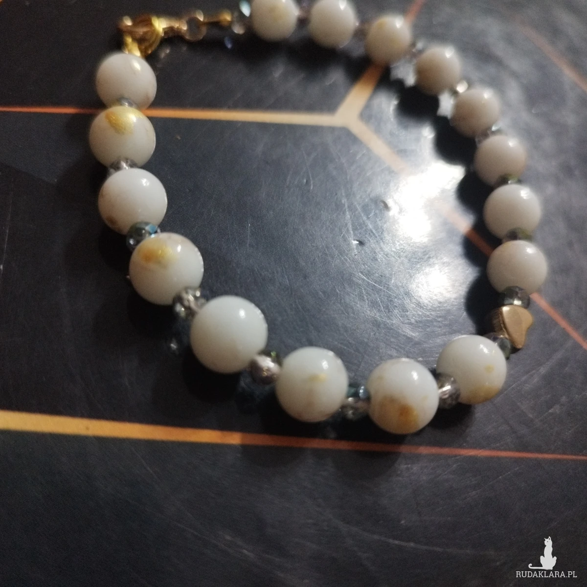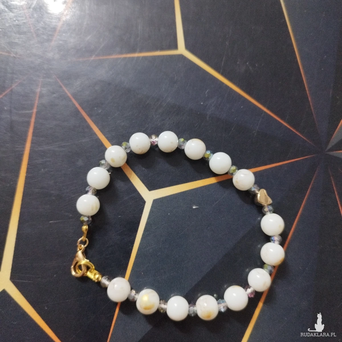 Bransoletka z białych kamieni z marmurkowym złotym wzorkiem i kryształków. Przekładka w kształcie serduszka. 20cm. Możliwość zmiany rozmiaru