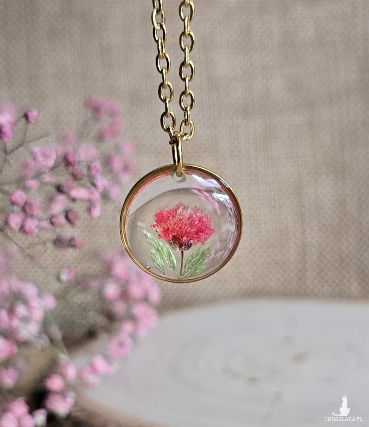 Oferuję Państwu unikalną biżuterię. Zawieszka jest wykonana z suszonych kwiatów i żywicy epoksydowej. Biżuteria jest wspaniałym i oryginalnym prezentem na lata.