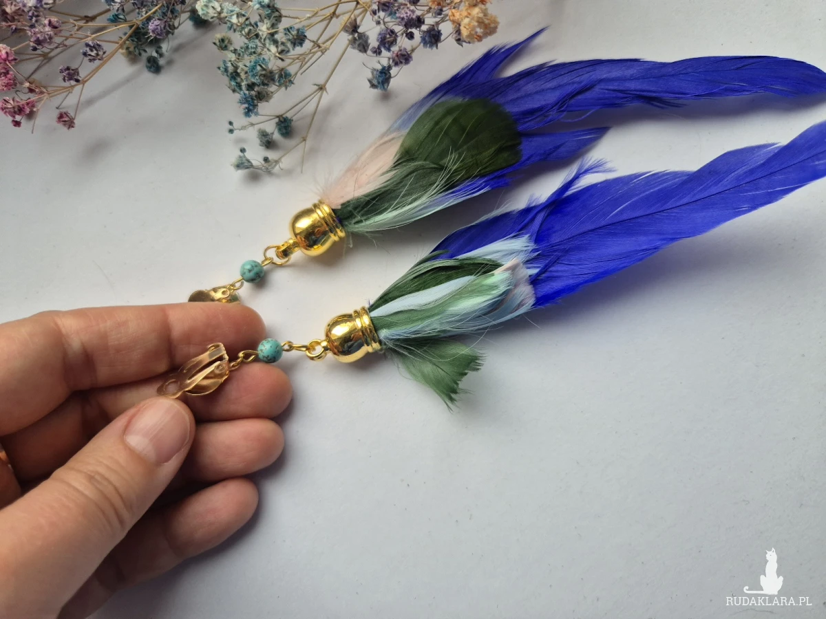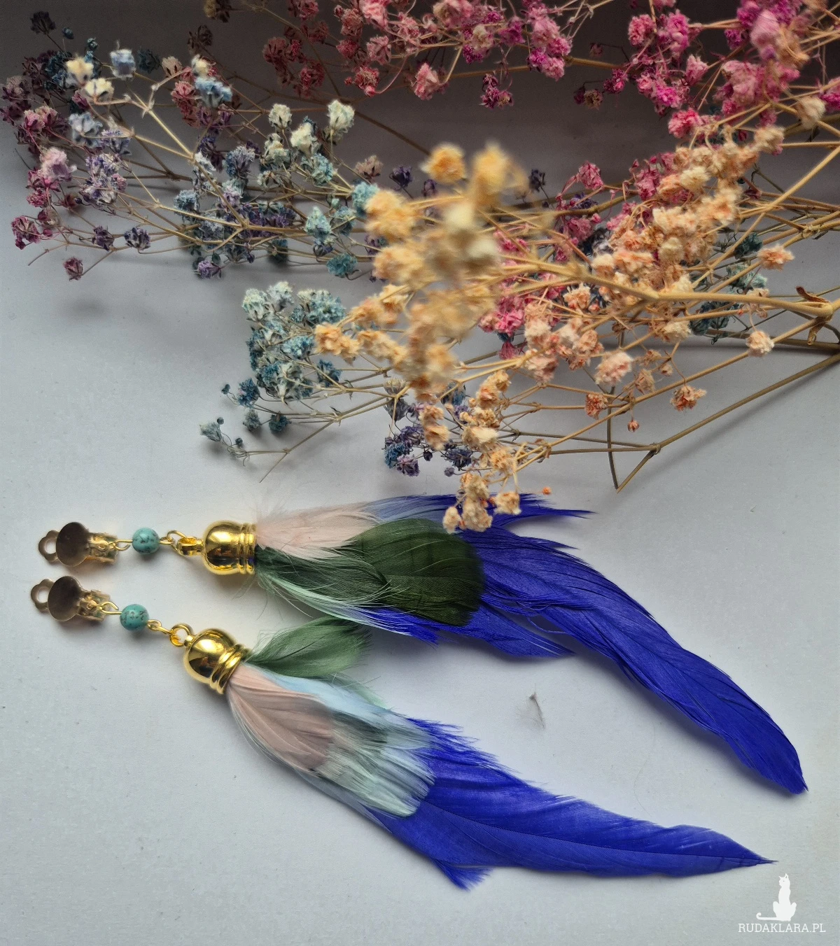Klipsy kolorowe energetyczne  pióra duże lekkie wykonane w pojedynczym egzemplarzu rękodzieło