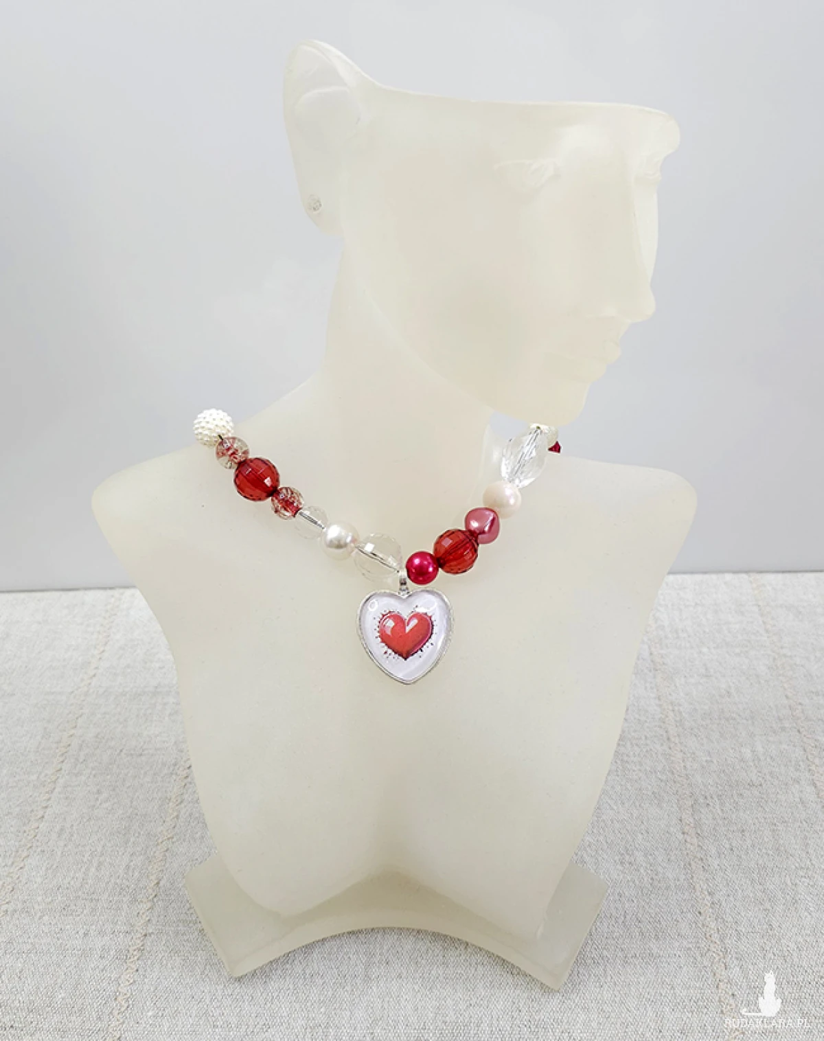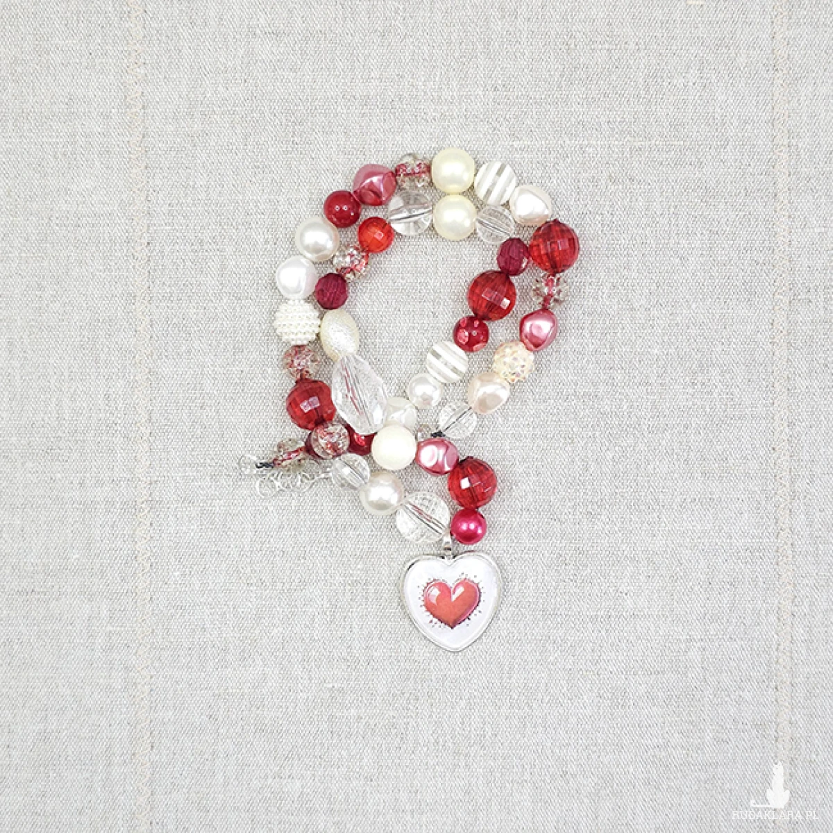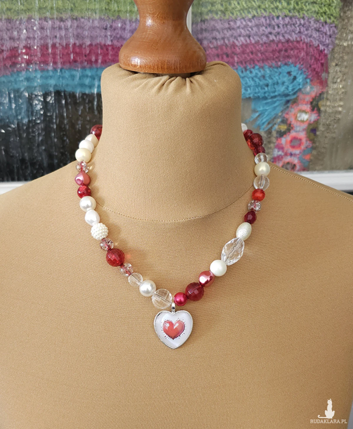 Został wykonany z bogatej mieszanki koralików w odcieniach intensywnej czerwieni oraz eleganckiej perłowej bieli i kremu.