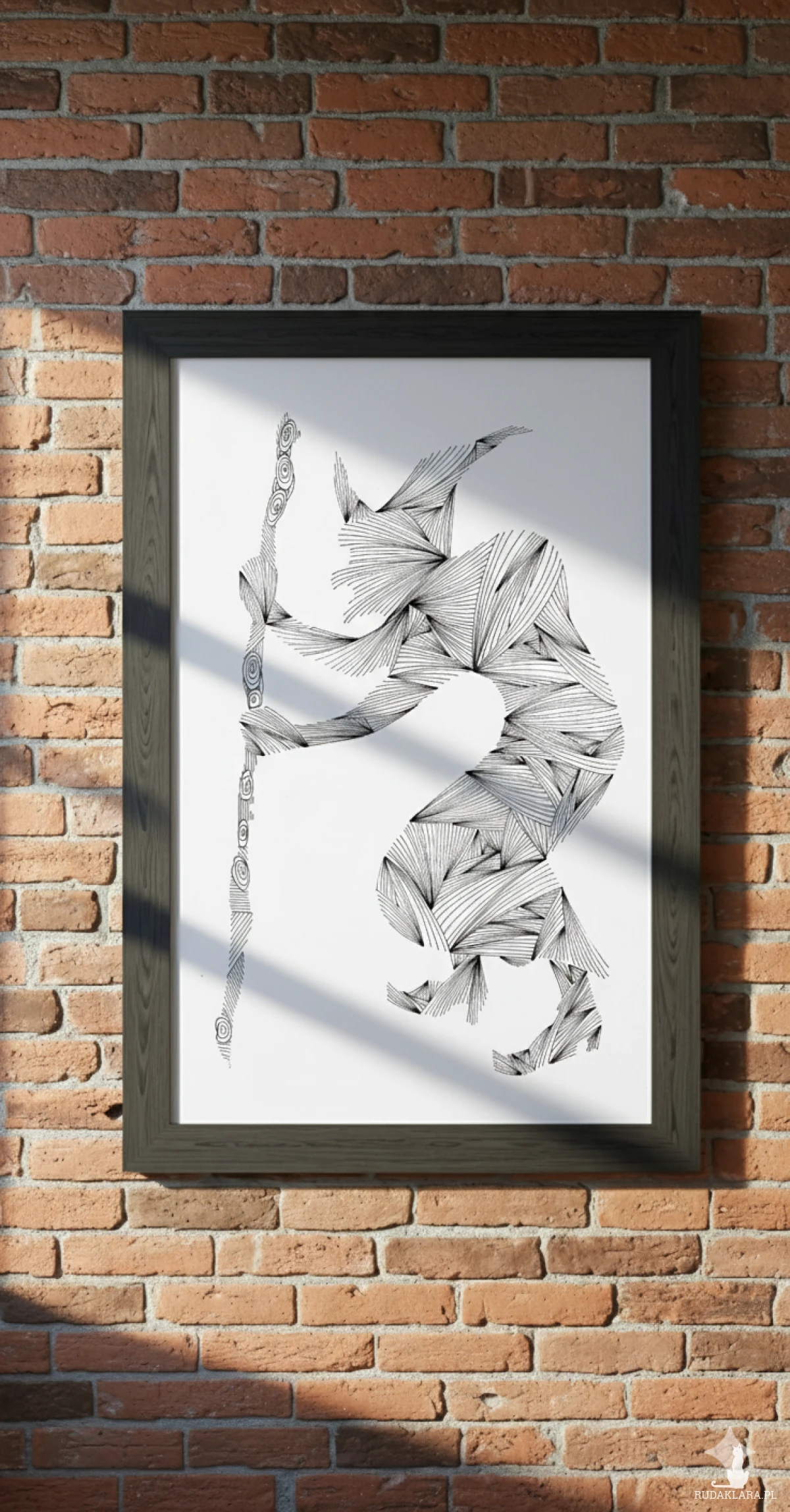 Monochromatyczna, geometryczna ilustracja figuralna przedstawiająca silnie stylizowaną postać wiedźmy. Sylwetka jest zbudowana wyłącznie z ostrych, geometrycznych segmentów i trójkątów, które są wypełnione gęstymi, równoległymi liniami. Laska, również geometryczna, kontrastuje z fragmentacją ciała spiralnymi i koncentrycznymi wzorami. Całość jest osadzona na białym tle, co podkreśla tajemniczość, ruch i analityczną, ukrytą siłę postaci.